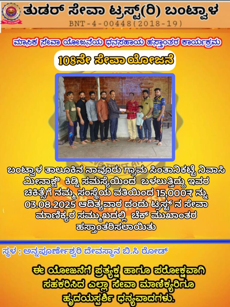 ಬಂಟ್ವಾಳ: ತಾಲೂಕಿನ ನಾವೂರು ಗ್ರಾಮ ಸಿಂತಾನಿಕಟ್ಟೆ ನಿವಾಸಿ ಮೀನಾಕ್ಷಿ ಕಿಡ್ನಿ ಸಮಸ್ಯೆಯಿಂದ ಬಳಲುತ್ತಿದ್ದು ಅವರ ಚಿಕಿತ್ಸೆಗೆ ತುಡರ್ ಸೇವಾ ಟ್ರಸ್ಟ್ (ರಿ.) 108ನೇ ಸೇವಾ ಯೋಜನೆ ಬಂಟ್ವಾಳ ಸಂಸ್ಥೆಯ ವತಿಯಿಂದ ರೂ. 15,000 ಸಹಾಯಧನದ ಚೆಕ್ ನ್ನು ಟ್ರಸ್ಟ್ ನ ಸೇವಾ ಮಾಣಿಕ್ಯರ ಸಮ್ಮುಖದಲ್ಲಿ ಬಿ.ಸಿ ರೋಡ್ ಅನ್ನಪೂರ್ಣೇಶ್ವರಿ ದೇವಸ್ಥಾನದಲ್ಲಿ ಜು.03 ರಂದು ಹಸ್ತಾಂತರಿಸಲಾಯಿತು.