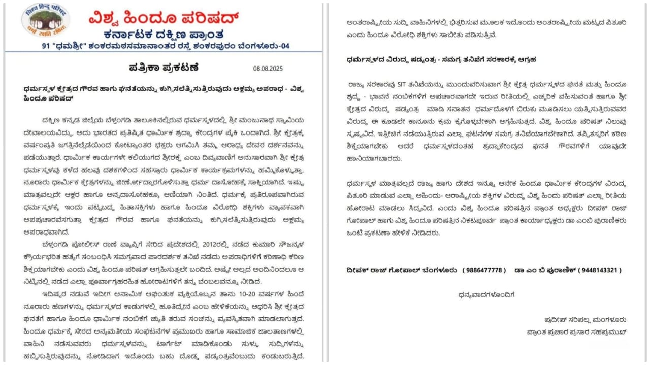 ಧರ್ಮಸ್ಥಳದ ವಿರುದ್ಧ ಷಡ್ಯಂತ್ರ – ಸಮಗ್ರ ತನಿಖೆಗೆ ಸರಕಾರಕ್ಕೆ ಆಗ್ರಹ ರಾಜ್ಯ ಸರಕಾರವು SIT ತನಿಖೆಯನ್ನು ಮುಂದುವರಿಸುವಾಗ ಶ್ರೀ ಕ್ಷೇತ್ರ ಧರ್ಮಸ್ಥಳದ ಘನತೆ ಮತ್ತು ಹಿಂದೂ ಶ್ರದ್ಧೆ – ಭಾವನೆ ನಂಬಿಕೆಗಳಿಗೆ ಅಪಚಾರವಾಗದೇ ಇರುವ ರೀತಿಯಲ್ಲಿ ಎಚ್ಚರಿಕೆ ವಹಿಸುವಂತೆ ಹಾಗೂ ಶ್ರೀ ಕ್ಷೇತ್ರದ ವಿರುದ್ಧ ಷಡ್ಯಂತ್ರ ಮಾಡಿ ಸನಾತನ ಧರ್ಮದೊಳಗೆ ಬಿರುಕು ಮೂಡಿಸಲು ಯತ್ನಿಸುತ್ತಿರುವವರ ವಿರುದ್ಧ ಈ ಕೂಡಲೇ ಕಾನೂನು ಕ್ರಮ ಕೈಗೊಳ್ಳಬೇಕಾಗಿ ಆಗ್ರಹಿಸುತ್ತದೆ. ವಿಶ್ವ ಹಿಂದೂ ಪರಿಷತ್ ನಿಲುವು ಸ್ಪಷ್ಟವಿದೆ, ಇತ್ತೀಚಿಗೆ ನಡೆಯುತ್ತಿರುವ ಎಲ್ಲಾ ಘಟನೆಗಳ ಸಮಗ್ರ ತನಿಖೆಯಾಗಬೇಕಾಗಿದೆ. ತಪ್ಪಿತಸ್ಥರಿಗೆ ಕಠಿಣ ಶಿಕ್ಷೆಯಾಗಬೇಕು ಆದರೆ ಧರ್ಮಸ್ಥಳದಂತಹ ಶ್ರದ್ಧಾಕೇಂದ್ರದ ಘನತೆ ಗೌರವಗಳಿಗೆ ಯಾವುದೇ ಹಾನಿಯಾಗಬಾರದು.