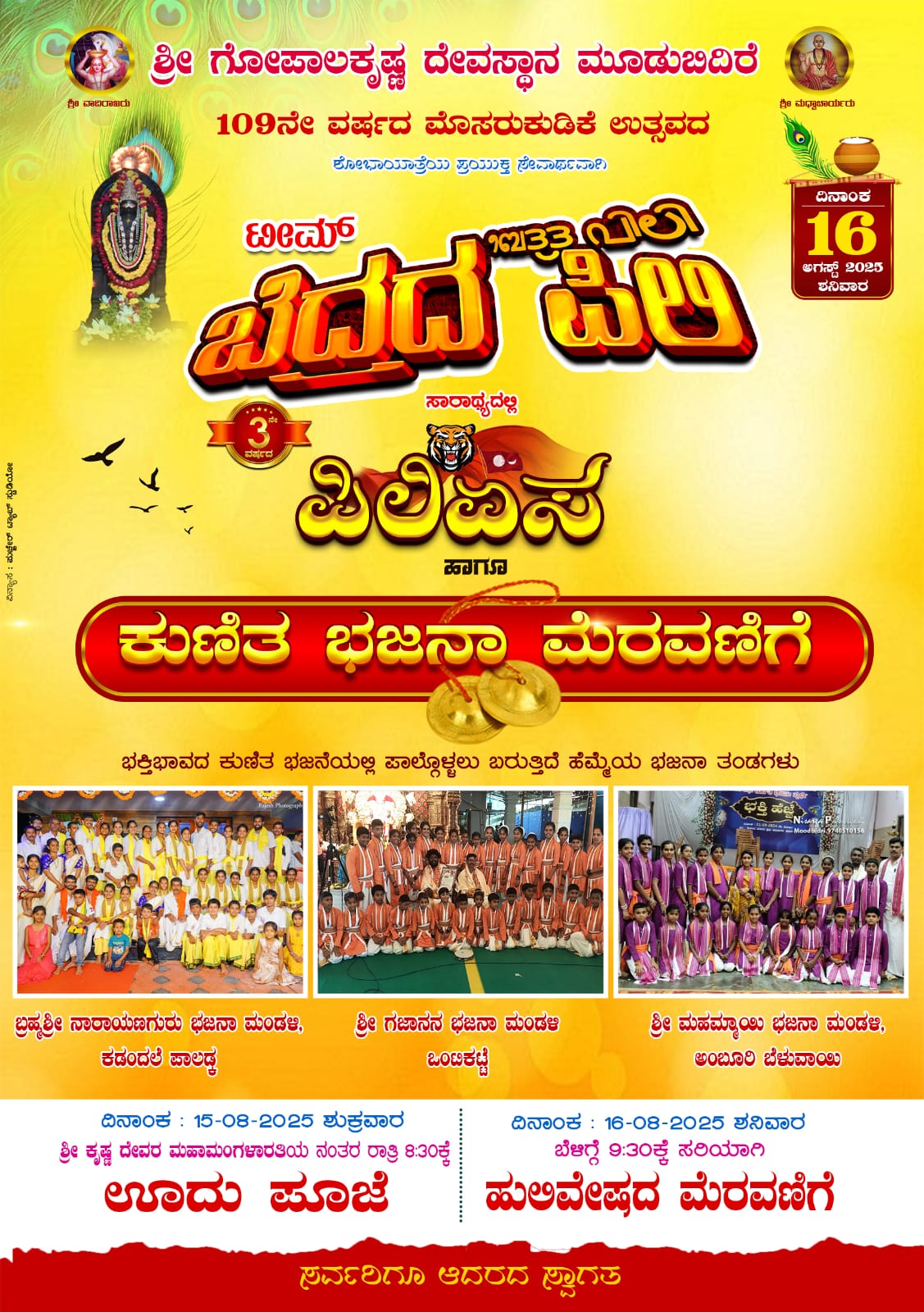 ಮೂಡುಬಿದಿರೆ : ಶ್ರೀ ಗೋಪಾಲಕೃಷ್ಣ ದೇವಸ್ಥಾನ ಮೂಡುಬಿದಿರೆಯ 109ನೇ ವರ್ಷದ ಮೊಸರುಕುಡಿಕೆ ಉತ್ಸವದ ಶೋಭಾಯಾತ್ರೆಯ ಪ್ರಯುಕ್ತ ಸೇವಾರ್ಥವಾಗಿ ಟೀಮ್ ಬೆದ್ರದ ಪಿಲಿ ಸಾರಾಥ್ಯದಲ್ಲಿ ಪಿಲಿ ಏಸ ಹಾಗೂ ಕುಣಿತ ಭಜನಾ ಮೆರವಣಿಗೆಯು ಆ. 16 ರ ಶನಿವಾರದಂದು ನಡೆಯಲಿದೆ.