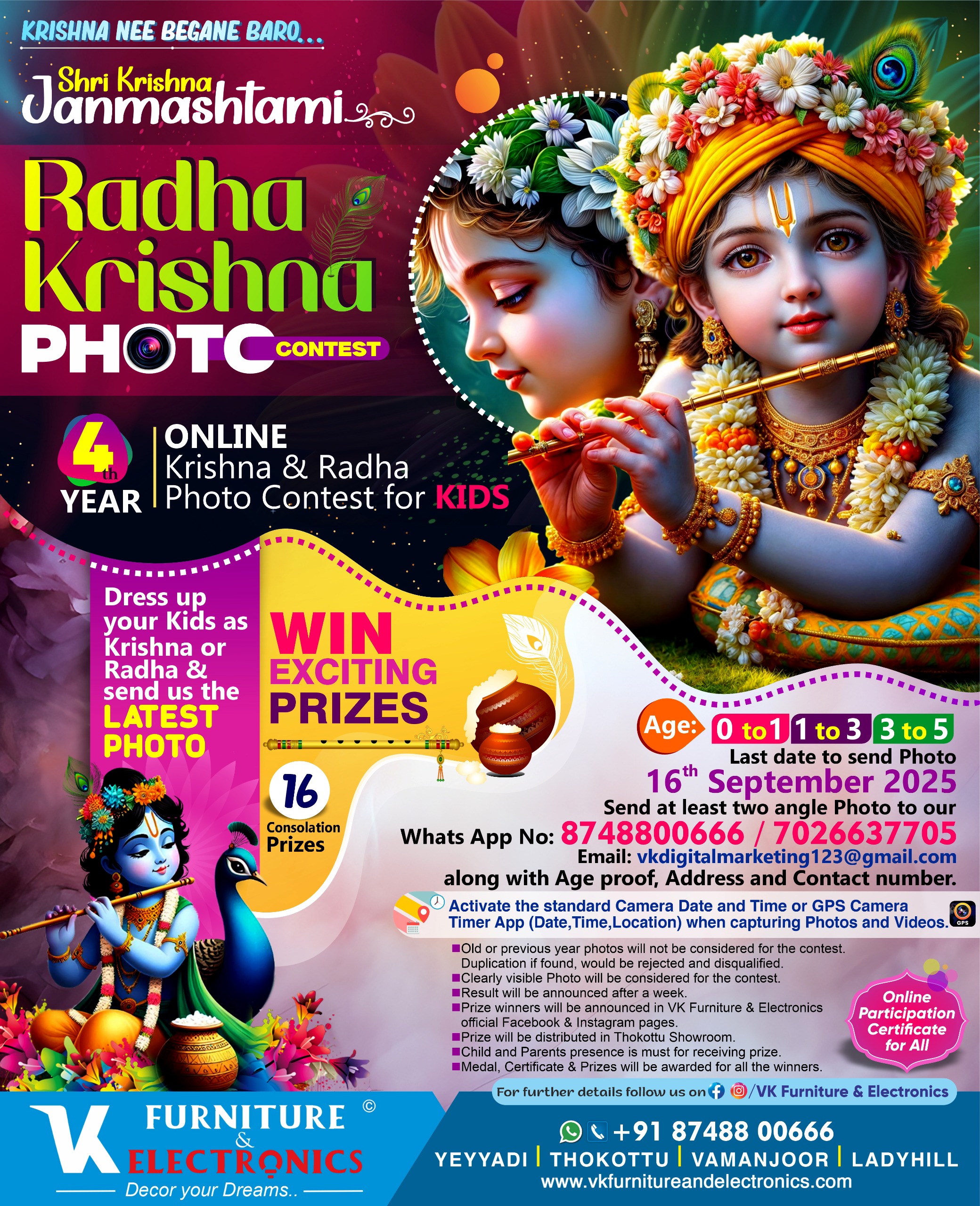 ಮಂಗಳೂರು: ಶ್ರೀಕೃಷ್ಣ ಜನ್ಮಾಷ್ಟಮಿಯ ಪ್ರಯುಕ್ತ, ವಿಕೆ ಫರ್ನೀಚರ್ & ಎಲೆಕ್ಟ್ರಾನಿಕ್ಸ್ ವತಿಯಿಂದ ಮಕ್ಕಳಿಗಾಗಿ 4ನೇ ವರ್ಷದ ಆನ್ಲೈನ್ ರಾಧಾ-ಕೃಷ್ಣ ಫೋಟೋ ಸ್ಪರ್ಧೆ ಘೋಷಿಸಲಾಗಿದೆ. ಈ ಸ್ಪರ್ಧೆಯಲ್ಲಿ ಪೋಷಕರು ತಮ್ಮ ಮಕ್ಕಳನ್ನು ರಾಧಾ ಅಥವಾ ಕೃಷ್ಣರಂತೆ ಸಿಂಗರಿಸಿ ಫೋಟೋಗಳನ್ನು ಕಳುಹಿಸಲು ಆಹ್ವಾನಿಸಲಾಗಿದೆ.