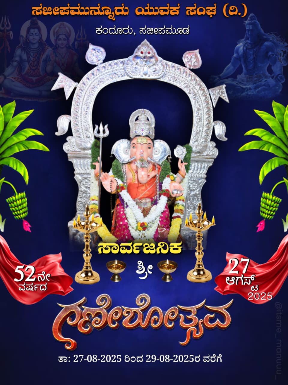 ಬಂಟ್ವಾಳ: ಸಜೀಪಮುನ್ನೂರು ಯುವಕ ಸಂಘ (ರಿ.) ಕಂದೂರು ಸಜೀಪಮೂಡ ಇದರ ವತಿಯಿಂದ 52ನೇ ವರ್ಷದ ಸಂಭ್ರಮದ ಸಾರ್ವಜನಿಕ ಶ್ರೀ ಗಣೇಶೋತ್ಸವವು ಆ. 27 ರಿಂದ 29 ರವರೆಗೆ ಕಂದೂರು ಸಜೀಪಮೂಡ ಸಂಘದ ಕಟ್ಟಡದಲ್ಲಿ ಜರುಗಲಿದೆ.