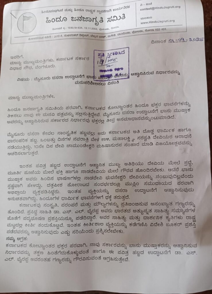 ಈ ಪವಿತ್ರ ಕಾರ್ಯಕ್ರಮದ ಉದ್ಘಾಟನೆಗೆ ಡಾ. ಎಸ್.ಎಲ್. ಭೈರಪ್ಪ ಅವರಂತಹ ಗಣ್ಯ ವ್ಯಕ್ತಿಗಳನ್ನು ಪರಿಗಣಿಸದೆ, ಭಾನು ಮುಷ್ತಾಕ್ ಅವರನ್ನು ಆಹ್ವಾನಿಸಿರುವುದು ಸರಿಯಲ್ಲ ಎಂದು ಸಮಿತಿ ಅಭಿಪ್ರಾಯಪಟ್ಟಿದೆ. “ಡಾ. ಎಸ್.ಎಲ್. ಭೈರಪ್ಪ ಅವರು ಭಾರತದ ಅತ್ಯುನ್ನತ ಸಾಹಿತ್ಯ ಪ್ರಶಸ್ತಿಗಳ ಜೊತೆಗೆ ಪದ್ಮಭೂಷಣ ಪ್ರಶಸ್ತಿಯನ್ನೂ ಪಡೆದಿದ್ದಾರೆ. ಅವರ ಸಾಹಿತ್ಯ ಮತ್ತು ದಾರ್ಶನಿಕ ಕೊಡುಗೆಗಳು ರಾಷ್ಟ್ರಮಟ್ಟದಲ್ಲಿ ಕರ್ನಾಟಕಕ್ಕೆ ಕೀರ್ತಿ ತಂದಿವೆ. ಇಂತಹ ಗೌರವಾನ್ವಿತ ವ್ಯಕ್ತಿಗಳನ್ನು ಕಡೆಗಣಿಸುವುದು ನಾಡಿನ ಸಂಸ್ಕೃತಿಗೆ ಮಾಡುವ ಅವಮಾನ,” ಎಂದು ಸಮಿತಿ ತಿಳಿಸಿದೆ. ಕೊಟ್ಯಾಂತರ ಹಿಂದೂ ಭಕ್ತರ ಭಾವನೆಗಳಿಗೆ ಗೌರವ ನೀಡಿ, ಭಾನು ಮುಷ್ತಾಕ್ ಅವರನ್ನು ಆಹ್ವಾನಿಸುವ ನಿರ್ಧಾರವನ್ನು ತಕ್ಷಣವೇ ಹಿಂತೆಗೆದುಕೊಳ್ಳಬೇಕೆಂದು ಮತ್ತು ಮೈಸೂರು ದಸರಾ ಹಬ್ಬದ ಪಾವಿತ್ರ್ಯವನ್ನು ಕಾಪಾಡಲು ಡಾ. ಎಸ್. ಎಲ್. ಭೈರಪ್ಪ ಅವರಂತಹ ಗಣ್ಯರನ್ನು ಆಹ್ವಾನಿಸಬೇಕೆಂದು ಹಿಂದೂ ಜನಜಾಗೃತಿ ಸಮಿತಿ ಈ ಮೂಲಕ ಆಗ್ರಹಿಸಿದೆ.