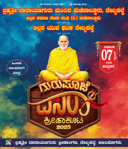 ಬಂಟ್ವಾಳ: ಬ್ರಹ್ಮಶ್ರೀ ನಾರಾಯಣಗುರು ಮಂದಿರ ನೇಲ್ಯಪಲ್ಕೆ ಇದರ ಆಶ್ರಯದಲ್ಲಿ ಬಿಲ್ಲವ ಯುವ ಘಟಕ ಸಮಿತಿ ಮಣಿನಾಲ್ಕೂರು ವತಿಯಿಂದ “ಗುರುಪೂಜೆ ದಸರಾ ಕ್ರೀಡಾಕೂಟ 2025” ಕಾರ್ಯಕ್ರಮವು ಸೆ. 7 ರಂದು ಅಜಿಲಮೊಗರು ನೇಲ್ಯಪಲ್ಕೆ ಬ್ರಹಶ್ರೀ ನಾರಾಯಣಗುರು ಕ್ರೀಡಾಂಗಣದಲ್ಲಿ ನಡೆಯಲಿದೆ.
