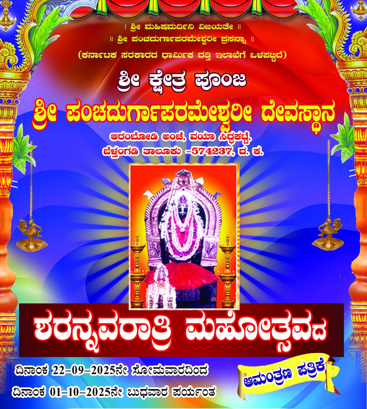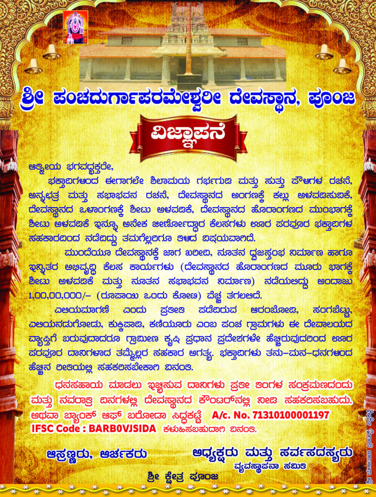 ಬೆಳ್ತಂಗಡಿ: ಶ್ರೀ ಕ್ಷೇತ್ರ ಪೂಂಜ, ಶ್ರೀ ಪಂಚದುರ್ಗಾಪರಮೇಶ್ವರೀ ದೇವಸ್ಥಾನದಲ್ಲಿ ಸೆ. 22ರಿಂದ ಅ. 01ರ ತನಕ ಶರನ್ನವರಾತ್ರಿ ಮಹೋತ್ಸವ ನಡೆಯಲಿದೆ.