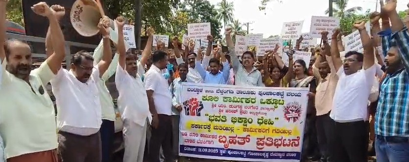 ಬಂಟ್ವಾಳ: ಕಳೆದ ಮೂರ್ನಾಲ್ಕು ತಿಂಗಳಿಂದ ಮರಳು ಮತ್ತು ಕೆಂಪು ಕಲ್ಲು ಸಮಸ್ಯೆ ಎದುರಾಗಿದ್ದು ಕಟ್ಟಡ ನಿರ್ಮಾಣ ಕೆಲಸಗಳು ಸ್ಥಗಿತಗೊಂಡಿದ್ದಲ್ಲದೆ ಕೂಲಿ ಕಾರ್ಮಿಕರು ಕೆಲಸವಿಲ್ಲದೆ ಕಂಗಾಲಾಗಿದ್ದಾರೆ. ಈ ಹಿನ್ನಲೆಯಲ್ಲಿ ಬಡ ಕೂಲಿ ಕಾರ್ಮಿಕರ ಬಾಳಿನ ಬೆಳಕಿಗಾಗಿ ಜಿಲ್ಲಾ ಪಂಚಾಯತ್ ಮಾಜಿ ಸದಸ್ಯ ತುಂಗಪ್ಪ ಬಂಗೇರ ಇವರ ನೇತೃತ್ವದಲ್ಲಿ ಸೆ. 11. ರಂದು “ಭವತಿ ಭಿಕ್ಷಾಂ ದೇಹಿ” ʼಸರ್ಕಾರಕ್ಕೆ ಮತಿಯಿಲ್ಲ, ಕಾರ್ಮಿಕರಿಗೆ ಗತಿಯಿಲ್ಲʼ ಎಂಬ ಘೋಷಣೆಯಡಿ ಗೋಪಾಲಕೃಷ್ಣ ದೇವಸ್ಥಾನ ವಠಾರದಲ್ಲಿ ಬೃಹತ್ ಪ್ರತಿಭಟನೆ ನಡೆಯಿತು.