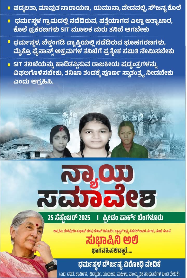 ಧರ್ಮಸ್ಥಳ ಗ್ರಾಮದಲ್ಲಿ ನಡೆದಿರುವ ಎಲ್ಲಾ ಅಸಹಜ ಸಾವುಗಳು , ಅತ್ಯಾಚಾರ , ಕೊಲೆ ಪ್ರಕರಣಗಳನ್ನು ಎಸ್ಐಟಿ ತನಿಖೆಗೆ ಒಳಪಡಿಸಬೇಕು , ಧರ್ಮಸ್ಥಳ ಗ್ರಾಮದಲ್ಲಿ ನಡೆದಿರುವ ಭೂ ಮಾಫಿಯಾ , ಮೈಕ್ರೋ ಫೈನಾನ್ಸ್ ಅಕ್ರಮ , ದೌರ್ಜನ್ಯಗಳ ಬಗ್ಗೆ ತನಿಖೆಗೆ ಪ್ರತ್ಯೇಕ ಸಮಿತಿ ರಚಿಸಬೇಕು , ಎಸ್ಐಟಿ ತಂಡಕ್ಕೆ ಪೂರ್ಣ ಸ್ವಾತಂತ್ರ್ಯ ನೀಡಬೇಕು ಮತ್ತು ಎಸ್ಐಟಿ ತನಿಖೆಯನ್ನು ಹಾದಿ ತಪ್ಪಿಸುವ ರಾಜಕೀಯ ಷಡ್ಯಂತ್ರಗಳನ್ನು ತಕ್ಷಣ ನಿಲ್ಲಿಸಬೇಕೆಂದು ಒತ್ತಾಯಿಸಿ ರಾಜ್ಯದ ಎಡ ,ದಲಿತ, ಆದಿವಾಸಿ ,ಕಾರ್ಮಿಕ , ರೈತ , ವಿದ್ಯಾರ್ಥಿ, ಯುವಜನ , ಮಹಿಳಾ, ಸಾಂಸ್ಕೃತಿಕ ಸಂಘಟನೆಗಳ ಜಂಟಿ ವೇದಿಕೆಯಾದ ಧರ್ಮಸ್ಥಳ ದೌರ್ಜನ್ಯ ವಿರೋಧಿ ವೇದಿಕೆ ನೇತೃತ್ವದಲ್ಲಿ ಈ ನ್ಯಾಯ ಸಮಾವೇಶ ಸಪ್ಟೆಂಬರ್ 25 ರಂದು ಬೆಂಗಳೂರಿನ ಫ್ರೀಡಂ ಪಾರ್ಕ್ ನಲ್ಲಿ ನಡೆಯಲಿದೆ.