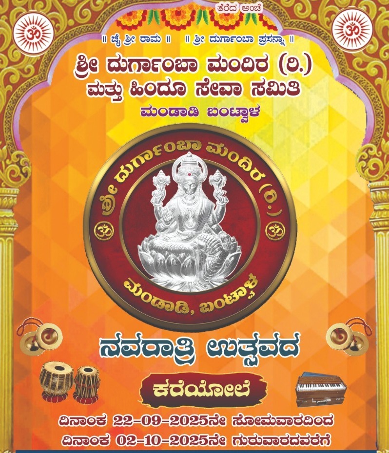 ಬಂಟ್ವಾಳ: ಶ್ರೀ ದುರ್ಗಾಂಬಾ ಮಂದಿರ (ರಿ.) ಮತ್ತು ಹಿಂದೂ ಸೇವಾ ಸಮಿತಿ ಮಂಡಾಡಿ ಬಂಟ್ವಾಳದಲ್ಲಿ ಸೆ.22 ಸೋಮವಾರದಿಂದ ಅ. 02 ಗುರುವಾರದವರೆಗೆ ನವರಾತ್ರಿ ಉತ್ಸವವೂ ನಡೆಯಲಿದೆ.