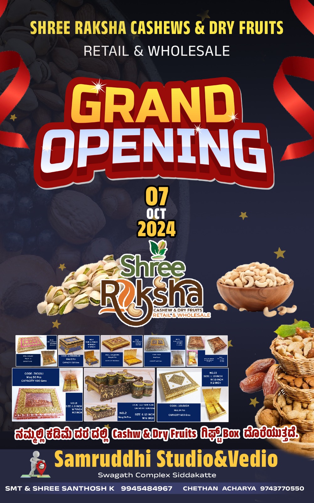 ನಾಳೆ (ಅ.7 ) ಸಿದ್ದಕಟ್ಟೆಯ ಸ್ವಾಗತ್ ಕಾಂಪ್ಲೆಕ್ಸ್ ನ ಸಮೃದ್ಧಿ ಸ್ಟುಡಿಯೋ ಇಲ್ಲಿ ಶ್ರೀ ರಕ್ಷಾ ಕ್ಯಾಶ್ಯುಸ್ ಮತ್ತು ಡ್ರೈ ಫ್ರೂಟ್ಸ್ ರಿಟೇಲ್ ಹಾಗೂ ಹೋಲ್ ಸೇಲ್ ವ್ಯಾಪಾರ ಸಂಸ್ಥೆ ಶುಭಾರಂಭಗೊಳ್ಳಲಿದೆ ಎಂದು ಸಂಸ್ಥೆಯ ಮುಖ್ಯಸ್ಥರು ಪ್ರಕಟಣೆಯಲ್ಲಿ ತಿಳಿಸಿದ್ದಾರೆ.
