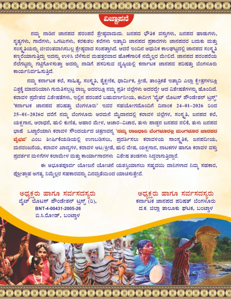 ಬಂಟ್ವಾಳ: ‘ಕರ್ನಾಟಕ ಜಾನಪದ ಪರಿಷತ್ತು ಬೆಂಗಳೂರು’ ಹಾಗೂ ವೈಟ್ ಲೋಟಸ್ ಪೌಂಡೇಶನ್ ಟ್ರಸ್ಟ್’ ಇವರ ಸಹಯೋಗದೊಂದಿಗೆ 2026 ಜನವರಿ 24 ಮತ್ತು 25 ರಂದು “ಬೆಂಗಳೂರಲ್ಲಿ ಮಂಗಳೂರ ಜಾನಪದ ವೈಭವ” ಕಾರ್ಯಕ್ರಮ ನಡೆಯಲಿದ್ದು ಇದರ ವಿಜ್ಞಾಪನೆ ಪತ್ರವು ಪೊಳಲಿ ಶ್ರೀ ರಾಜರಾಜೇಶ್ವರಿ ದೇವಸ್ಥಾನದ ಮುಂಭಾಗದಲ್ಲಿ ಸೆ.26ರಂದು ಬಿಡುಗೊಂಡಿತು.