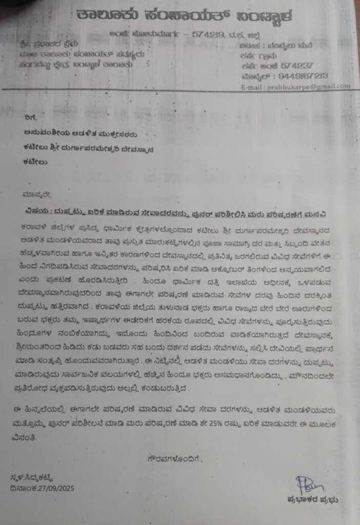 ಮನವಿಯಲ್ಲಿ,ಕರಾವಳಿ ಜಿಲ್ಲೆಗಳ ಪ್ರಸಿದ್ದ ಧಾರ್ಮಿಕ ಕ್ಷೇತ್ರಗಳಲ್ಲೊಂದಾದ ಕಟೀಲು ಶ್ರೀ ದುರ್ಗಾಪರಮೇಶ್ವರಿ ದೇವಸ್ಥಾನದ ಆಡಳಿತ ಮಂಡಳಿಯವರಾದ ತಾವು ಪ್ರಸ್ತುತ ಮಾರುಕಟ್ಟೆಗಳಲ್ಲಿನ ಪೂಜಾ ಸಾಮಾಗ್ರಿ ದರ ಹೆಚ್ಚಳ ಮತ್ತು ಸಿಬ್ಬಂದಿ ವೇತನ ಹೆಚ್ಚಳವಾಗಿರುವ ಹಾಗೂ ಇನ್ನಿತರ ಕಾರಣಗಳಿಂದ ದೇವಸ್ಥಾನದಲ್ಲಿ ಪ್ರತಿನಿತ್ಯ ಜರಗಲಿರುವ ವಿವಿಧ ಸೇವೆಗಳಿಗೆ ಈ ಹಿಂದೆ ನಿಗದಿಪಡಿಸಿರುವ ಸೇವಾದರಗಳನ್ನು ಪರಿಷ್ಕರಿಸಿ ಏರಿಕೆ ಮಾಡಿ ಅಕ್ಟೋಬರ್ ತಿಂಗಳಿಂದ ಅನ್ವಯವಾಗಲಿದೆ ಎಂದು ಪ್ರಕಟಣೆ ಹೊರಡಿಸಿರುತ್ತೀರಿ.