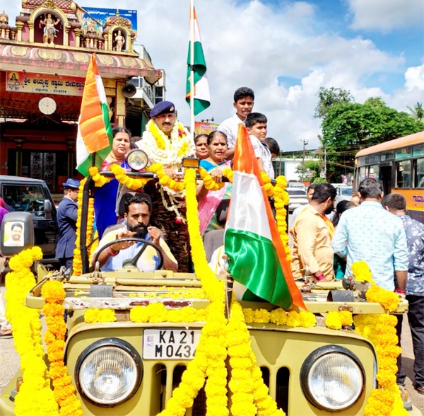 ಬೆಳ್ತಂಗಡಿ: ಭಾರತೀಯ ಸೇನೆಯಲ್ಲಿ 22 ವರ್ಷಗಳ ಕಾಲ ಸೇವೆಯನ್ನು ಸಲ್ಲಿಸಿ ನಿವೃತ್ತಿಗೊಂಡು ಹುಟ್ಟೂರಿಗೆ ಆಗಮಿಸಿದ ಲಾಯಿಲ ಗ್ರಾಮದ ವಿವೇಕಾನಂದ ನಗರದ ನಿವಾಸಿ ಹೆಮ್ಮೆಯ ಯೋಧರಾದ ಅಶೋಕ್ ಕುಮಾರ್ ರವರನ್ನು ಬೆಳ್ತಂಗಡಿಯ ಸಂತೆಕಟ್ಟೆಯಲ್ಲಿ ಅದ್ಧೂರಿಯಾಗಿ ಸ್ವಾಗತಿಸಲಾಯಿತು.