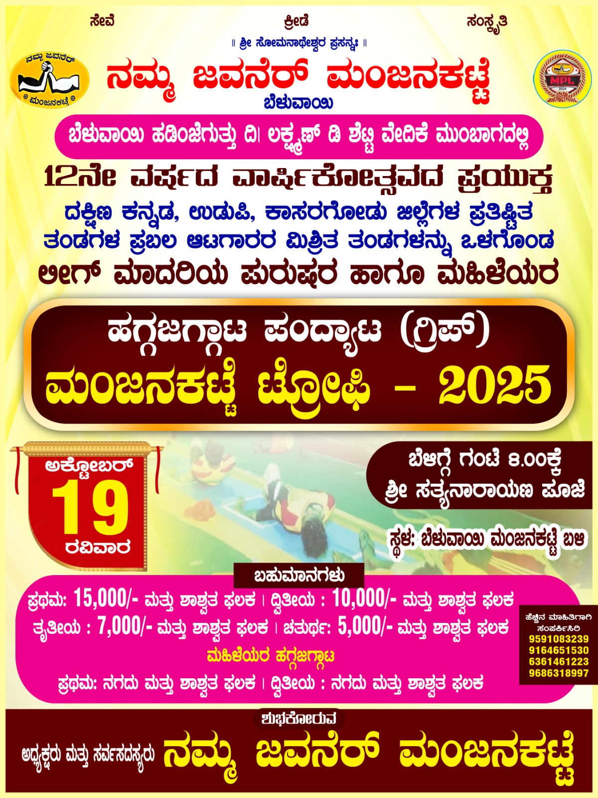 ಮೂಡಬಿದಿರೆ: ನಮ್ಮ ಜವನೆರ್ ಮಂಜನಕಟ್ಟೆ ಬೆಳುವಾಯಿ ಇದರ 12ನೇ ವರ್ಷದ ವಾರ್ಷಿಕೋತ್ಸವದ ಪ್ರಯುಕ್ತ ಹಗ್ಗಜಗ್ಗಾಟ ಪಂದ್ಯಾಟ (ಗ್ರಿಪ್) ಮಂಜನಕಟ್ಟೆ ಟ್ರೋಫಿ – 2025 ಅ.19ರಂದು ಬೆಳುವಾಯಿ ಹಡಿಂಜೆಗುತ್ತು ದಿ। ಲಕ್ಷ್ಮಣ್ ಡಿ ಶೆಟ್ಟಿ ವೇದಿಕೆ ಮುಂಭಾಗದಲ್ಲಿ ನಡೆಯಲಿದೆ.