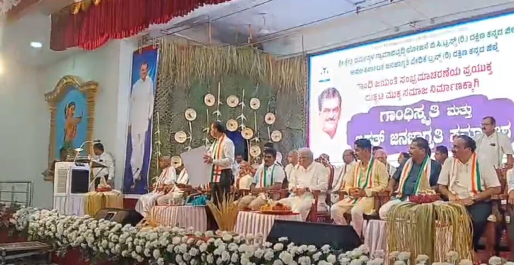 ಪುತ್ತೂರಿನ ತೆಂಕಿಲ ಒಕ್ಕಲಿಗ ಗೌಡ ಸಮುದಾಯ ಭವನದಲ್ಲಿ ಬುಧವಾರ ಧರ್ಮಸ್ಥಳ ಗ್ರಾಮಾಭಿವೃದ್ಧಿ ಯೋಜನೆ, ಬಿ.ಸಿ ಟ್ರಸ್ಟ್, ಅಖಿಲ ಕರ್ನಾಟಕ ಜನಜಾಗೃತಿ ವೇದಿಕೆಯ ವತಿಯಿಂದ ಗಾಂಧಿ ಜಯಂತಿ ಸಂಭ್ರಮಾಚರಣೆಯ ಪ್ರಯುಕ್ತ ದುಶ್ಚಟ ಮುಕ್ತ ಸಮಾಜ ನಿರ್ಮಾಣಕ್ಕಾಗಿ ಗಾಂಧಿಸ್ಮೃತಿ ಮತ್ತು ಬೃಹತ್ ಜನಜಾಗೃತಿ ಸಮಾವೇಶ ಉದ್ಘಾಟಿಸಿ ಅವರು ಮಾತನಾಡಿದರು.