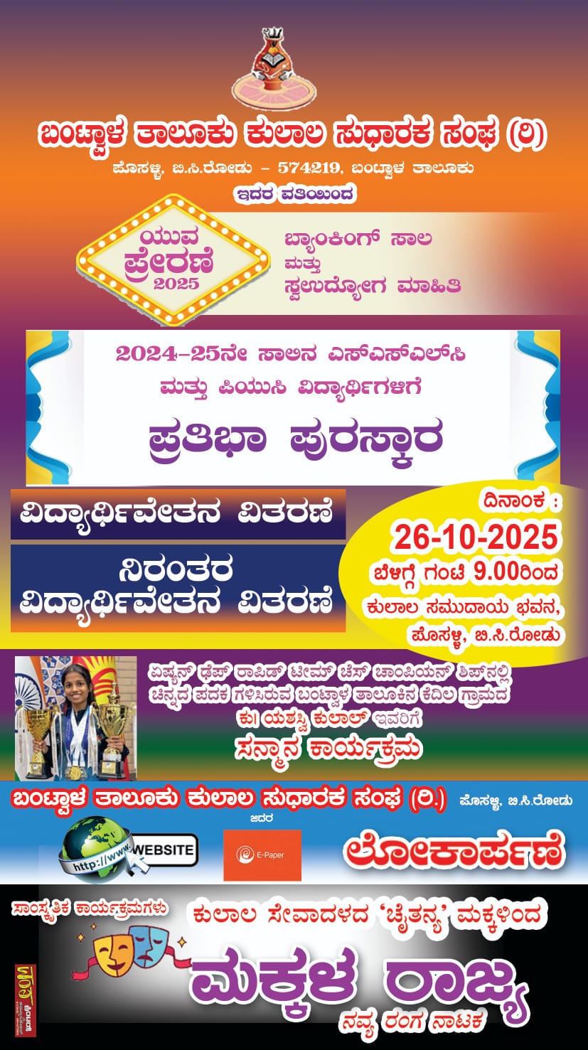 ಬಂಟ್ವಾಳ : ಬಂಟ್ವಾಳ ತಾಲೂಕು ಕುಲಾಲ ಸುಧಾರಕ ಸಂಘ (ರಿ.) ವತಿಯಿಂದ ‘ಯುವ ಪ್ರೇರಣೆ – 2025ʼ ಬ್ಯಾಂಕಿಂಗ್ ಸಾಲ ಮತ್ತು ಸ್ವಉದ್ಯೋಗ ಮಾಹಿತಿ ಕಾರ್ಯಾಗಾರವು ಬಿ.ಸಿ.ರೋಡಿನ ಪೊಸಳ್ಳಿ ಕುಲಾಲ ಭವನದಲ್ಲಿ ಅ. 26ರಂದು ನಡೆಯಲಿದೆ.