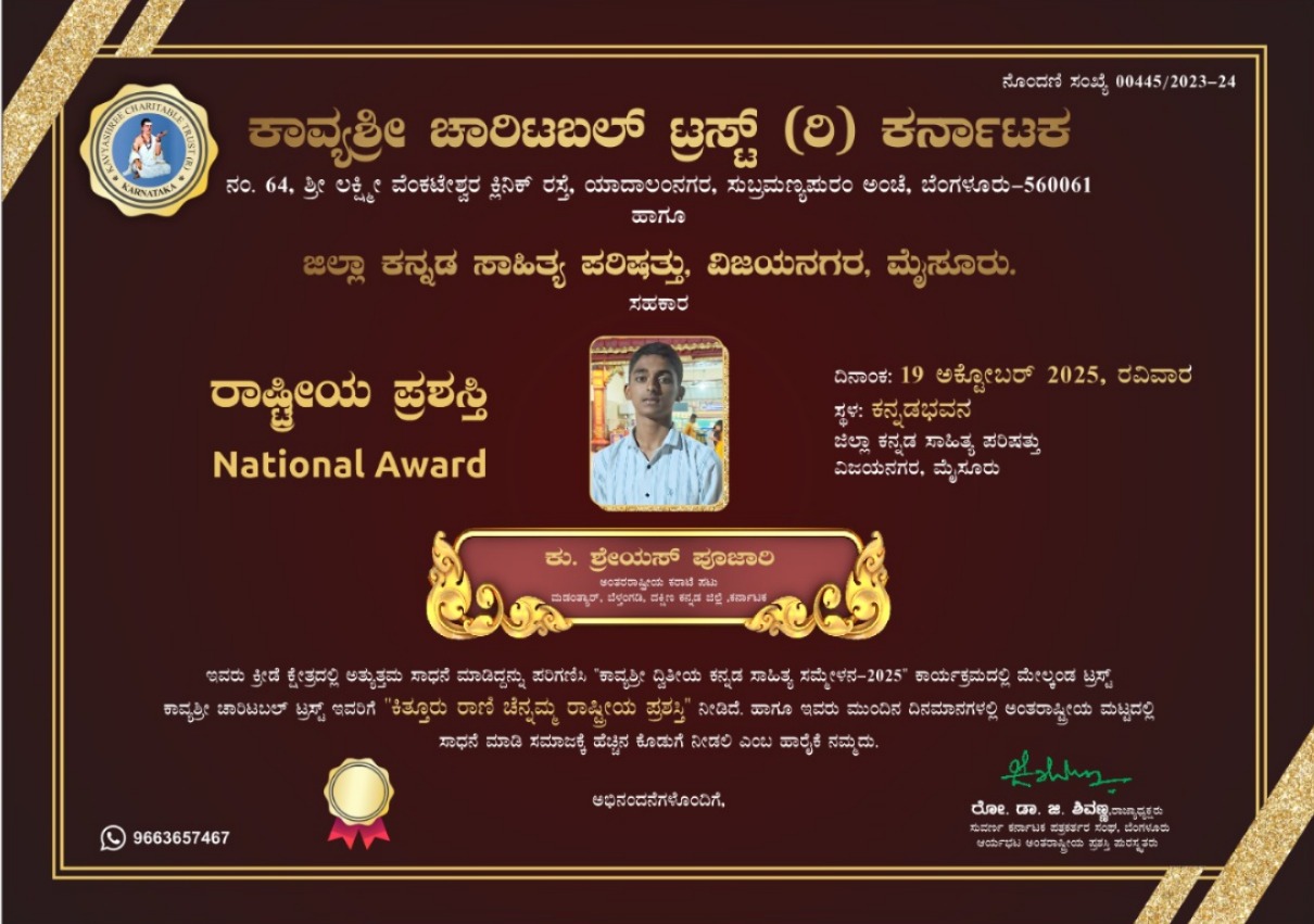 ಅ.19 ರಂದು ಮೈಸೂರಿನ ವಿಜಯನಗರದ ಜಿಲ್ಲಾ ಕನ್ನಡ ಸಾಹಿತ್ಯ ಪರಿಷತ್ತು ಕನ್ನಡಭವನದಲ್ಲಿ ನಡೆಯುವ ‘ಕಾವ್ಯಶ್ರೀ ದ್ವಿತೀಯ ಕನ್ನಡ ಸಾಹಿತ್ಯ ಸಮ್ಮೇಳನ-2025’ ಕಾರ್ಯಕ್ರಮದಲ್ಲಿ ಪ್ರಶಸ್ತಿ ಪ್ರದಾನವಾಗಲಿದೆ.