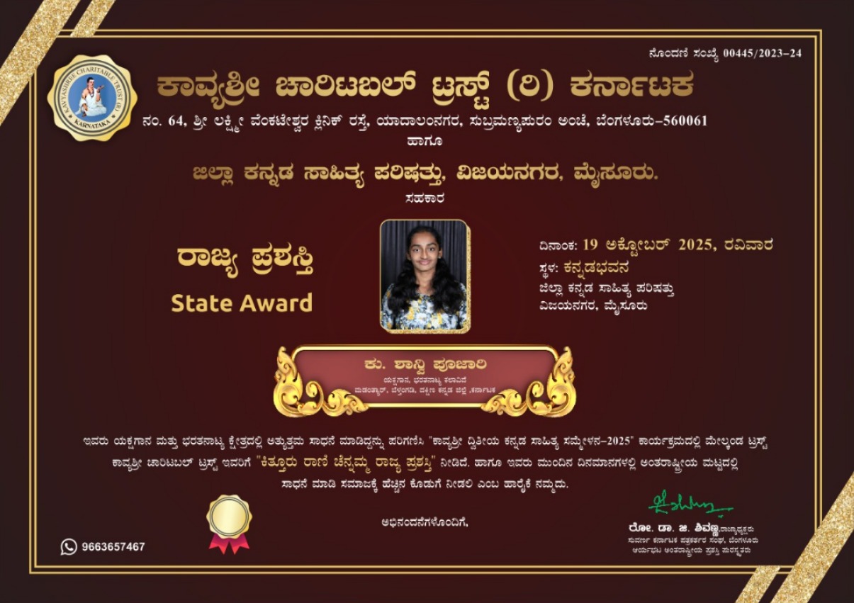 ಮಡಂತ್ಯಾರ್: ಕಾವ್ಯಶ್ರೀ ಚಾರಿಟಬಲ್ ಟ್ರಸ್ಟ್ (ರಿ) ಕರ್ನಾಟಕ ಹಾಗೂ ಜಿಲ್ಲಾ ಕನ್ನಡ ಸಾಹಿತ್ಯ ಪರಿಷತ್ತು, ವಿಜಯನಗರ, ಮೈಸೂರು ಇವರ ಸಹಕಾರದಿಂದ ಅ. 19 ರಂದು ಮೈಸೂರಿನ ವಿಜಯನಗರದ ಜಿಲ್ಲಾ ಕನ್ನಡ ಸಾಹಿತ್ಯ ಪರಿಷತ್ತು ಕನ್ನಡಭವನದಲ್ಲಿ ನಡೆಯುವ ‘ಕಾವ್ಯಶ್ರೀ ದ್ವಿತೀಯ ಕನ್ನಡ ಸಾಹಿತ್ಯ ಸಮ್ಮೇಳನ-2025’ ಕಾರ್ಯಕ್ರಮದಲ್ಲಿ ಕು. ಶಾನ್ವಿ ಪೂಜಾರಿ ಯವರಿಗೆ ಕಿತ್ತೂರು ರಾಣಿ ಚೆನ್ನಮ್ಮ ರಾಜ್ಯ ಪ್ರಶಸ್ತಿ ನೀಡಿ ಗೌರವಿಸಲಿದೆ.