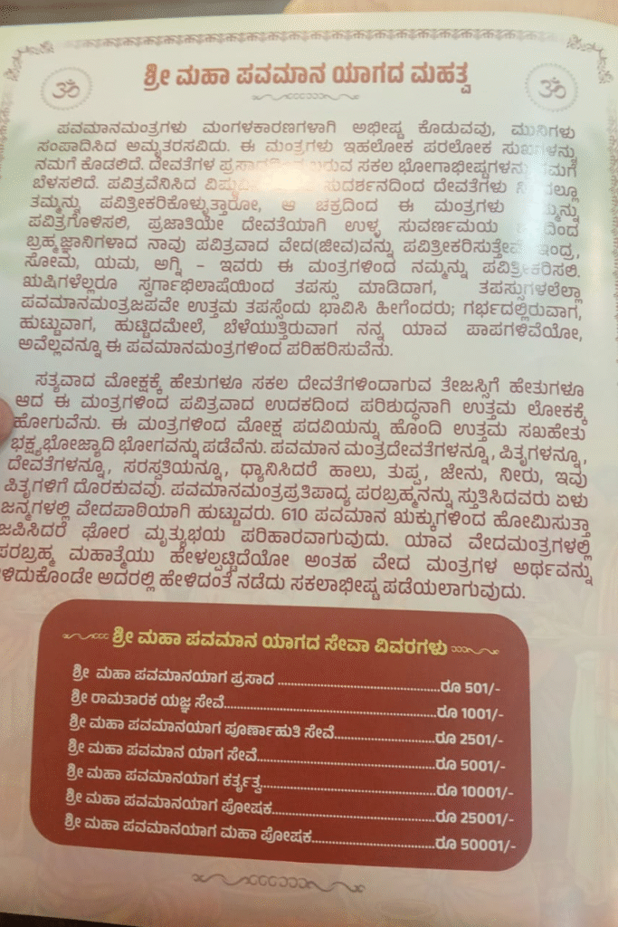 ಈ ಮಹಾ ಪವಮಾನ ಯಾಗದ ದೀಪೋಜ್ವಲನೆಯನ್ನು ಪುತ್ತೂರಿನ ವಿವೇಕಾನಂದ ವಿದ್ಯಾವರ್ಧಕ ಸಂಘದ ಅಧ್ಯಕ್ಷ ಡಾ. ಪ್ರಭಾಕರ ನೆರವೇರಿಸಲಿದ್ದಾರೆ.
