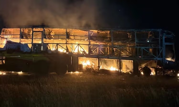 ಅಧಿಕೃತ ಮೂಲಗಳ ಪ್ರಕಾರ, ಈ ಘಟನೆ ಬೆಳಗಿನ ಜಾವ 3:30 ರ ಸುಮಾರಿಗೆ ಸಂಭವಿಸಿದ್ದು, ಬಸ್ ದ್ವಿಚಕ್ರ ವಾಹನ ಢಿಕ್ಕಿ ಹೊಡೆದ ಪರಿಣಾಮ ಏಕಾಏಕಿ ಭಾರಿ ಬೆಂಕಿ ಹೊತ್ತಿಕೊಂಡಿದ್ದು, ಅದು ಕ್ಷಣಾರ್ಧದಲ್ಲಿ ಇಡೀ ಬಸ್ಸನ್ನು ಆವರಿಸಿಕೊಂಡಿದೆ.
