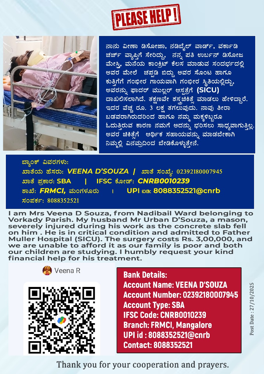 ಈ ನಿಟ್ಟಿನಲ್ಲಿ ಸಹೃದಯಿ ದಾನಿಗಳ ಸಹಾಯ ನಿರೀಕ್ಷೆಯಲಿದ್ದಾರೆ ಉರ್ಬನ್ ಡಿಸೋಜ ಮತ್ತವರ ಪತ್ನಿ ವೀಣಾ ಡಿಸೋಜಾ.