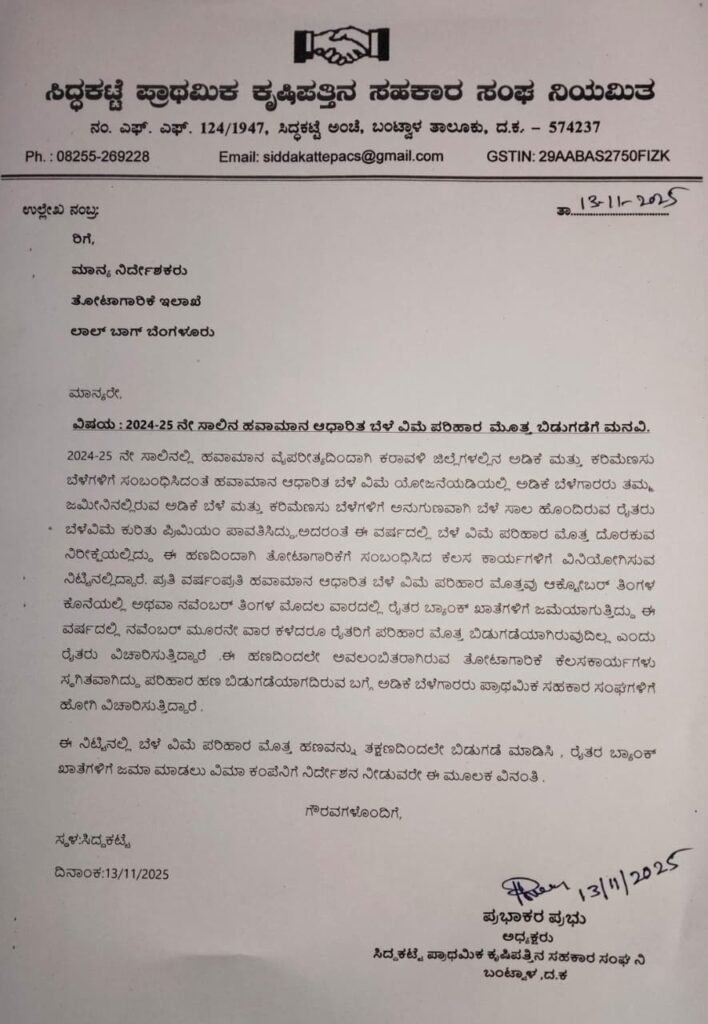 2024-25 ನೇ ಸಾಲಿನಲ್ಲಿ ಹವಾಮಾನ ವೈಪರೀತ್ಯದಿಂದಾಗಿ ಕರಾವಳಿ ಜಿಲ್ಲೆಗಳಲ್ಲಿನ ಅಡಿಕೆ ಮತ್ತು ಕರಿಮೆಣಸು ಬೆಳೆಗಳಿಗೆ ಸಂಬಂಧಿಸಿದಂತೆ ಹವಾಮಾನ ಆಧಾರಿತ ಬೆಳೆ ವಿಮೆ ಯೋಜನೆಯಡಿಯಲ್ಲಿ ಅಡಿಕೆ ಬೆಳೆಗಾರರು ತಮ್ಮ ಜಮೀನಿನಲ್ಲಿರುವ ಅಡಿಕೆ ಬೆಳೆ ಮತ್ತು ಕರಿಮೆಣಸು ಬೆಳೆಗಳಿಗೆ ಅನುಗುಣವಾಗಿ ಬೆಳೆ ಸಾಲ ಹೊಂದಿರುವ ರೈತರು ಬೆಳೆವಿಮೆ ಕುರಿತು ಪ್ರಿಮಿಯಂ ಪಾವತಿಸಿದ್ದು,ಅದರಂತೆ ಈ ವರ್ಷದಲ್ಲಿ ಬೆಳೆ ವಿಮೆ ಪರಿಹಾರ ಮೊತ್ತ ದೊರಕುವ ನಿರೀಕ್ಷೆಯಲ್ಲಿದ್ದು ಈ ಹಣದಿಂದಾಗಿ ತೋಟಾಗಾರಿಕೆಗೆ ಸಂಬಂಧಿಸಿದ ಕೆಲಸ ಕಾರ್ಯಗಳಿಗೆ ವಿನಿಯೋಗಿಸುವ ನಿಟ್ಟಿನಲ್ಲಿದ್ದಾರೆ. ಪ್ರತಿ ವರ್ಷಂಪ್ರತಿ ಹವಾಮಾನ ಆಧಾರಿತ ಬೆಳೆ ವಿಮೆ ಪರಿಹಾರ ಮೊತ್ತವು ಅಕ್ಟೋಬರ್ ತಿಂಗಳ ಕೊನೆಯಲ್ಲಿ ಅಥವಾ ನವೆಂಬರ್ ತಿಂಗಳ ಮೊದಲ ವಾರದಲ್ಲಿ ರೈತರ ಬ್ಯಾಂಕ್ ಖಾತೆಗಳಿಗೆ ಜಮೆಯಾಗುತ್ತಿದ್ದು ಈ ವರ್ಷದಲ್ಲಿ ನವೆಂಬರ್ ಮೂರನೇ ವಾರ ಕಳೆದರೂ ರೈತರಿಗೆ ಪರಿಹಾರ ಮೊತ್ತ ಬಿಡುಗಡೆಯಾಗಿರುವುದಿಲ್ಲ ಎಂದು ರೈತರು ವಿಚಾರಿಸುತ್ತಿದ್ದಾರೆ .ಈ ಹಣದಿಂದಲೇ ಅವಲಂಬಿತರಾಗಿರುವ ತೋಟಾಗಾರಿಕೆ ಕೆಲಸಕಾರ್ಯಗಳು ಸ್ಥಗಿತವಾಗಿದ್ದು ಪರಿಹಾರ ಹಣ ಬಿಡುಗಡೆಯಾಗದಿರುವ ಬಗ್ಗೆ ಅಡಿಕೆ ಬೆಳೆಗಾರರು ಪ್ರಾಥಮಿಕ ಸಹಕಾರ ಸಂಘಗಳಿಗೆ ಹೋಗಿ ವಿಚಾರಿಸುತ್ತಿದ್ದಾರೆ .