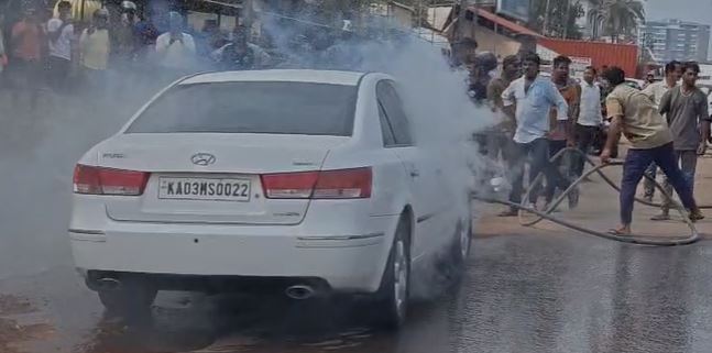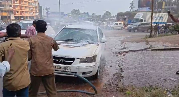 ಬೆಂಗಳೂರು ಆರ್ ಟಿ ಓ ನೋಂದಣಿಯ ಬಿಳಿ ಬಣ್ಣದ ಕಾರಿನಲ್ಲಿ ದಾರಿ ಮಧ್ಯೆ ಬೆಂಕಿ ಕಾಣಿಸಿಕೊಂಡಿದೆ.ಕಾರು ಹೊತ್ತಿ ಉರಿಯುತ್ತಿರುವಾಗ ಡೈನೇಜ್ ಸಕ್ಕಿಂಗ್ ವಾಹನದಲ್ಲಿದ್ದ ನೀರಿನಿಂದ ಬೆಂಕಿ ನಂದಿಸುವ ಪ್ರಯತ್ನ ಮಾಡಲಾಗಿದೆ.