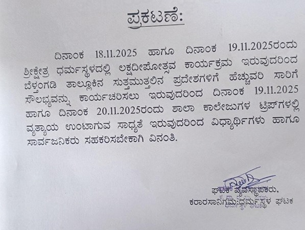 ಬೆಳ್ತಂಗಡಿ: ಶ್ರೀಕ್ಷೇತ್ರ ಧರ್ಮಸ್ಥಳದಲ್ಲಿ ನ.18 ಹಾಗೂ 19 ರಂದು ಲಕ್ಷದೀಪೋತ್ಸವ ಕಾರ್ಯಕ್ರಮ ಇರುವುದರಿಂದ ಬೆಳ್ತಂಗಡಿ ತಾಲೂಕಿನ ಸುತ್ತಮುತ್ತಲಿನ ಪ್ರದೇಶಗಳಿಗೆ ಹೆಚ್ಚುವರಿ ಸಾರಿಗೆ ಸೌಲಭ್ಯಗಳಿರಲಿದೆ.