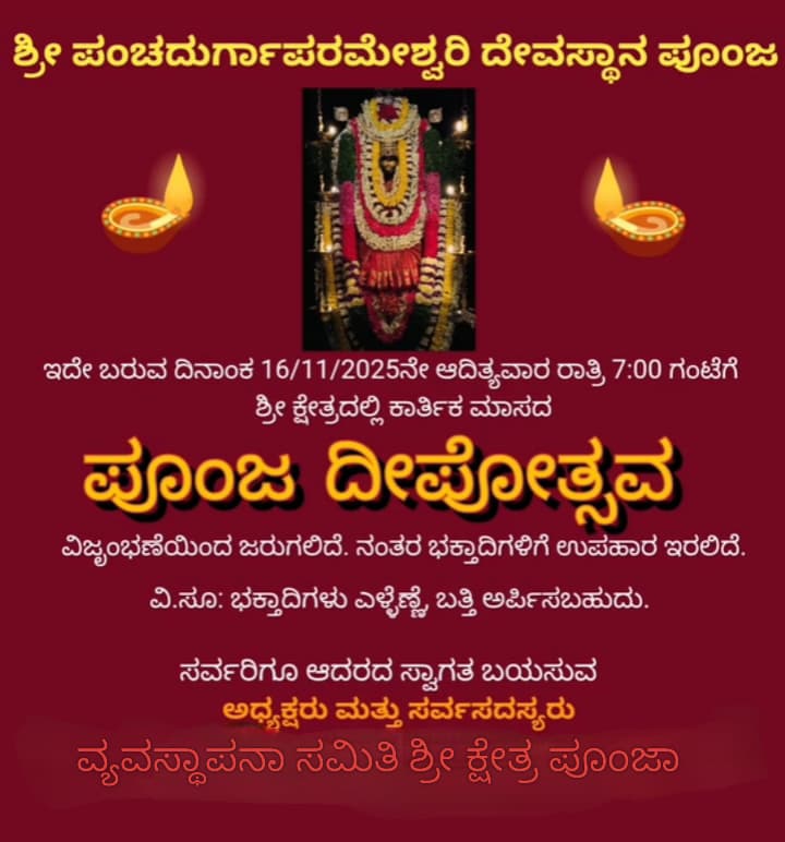 ಬೆಳ್ತಂಗಡಿ: ತಾಲೂಕಿನ ಪೂಂಜದ ಶ್ರೀ ಪಂಚದುರ್ಗಾಪರಮೇಶ್ವರಿ ದೇವಸ್ಥಾನದಲ್ಲಿ ನ.16 ರಂದು ರಾತ್ರಿ 7:00 ಗಂಟೆಗೆ ಕಾರ್ತಿಕ ಮಾಸದ ಪೂಂಜ ದೀಪೋತ್ಸವ ನಡೆಯಲಿದೆ.