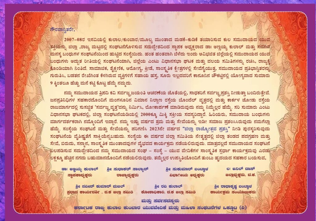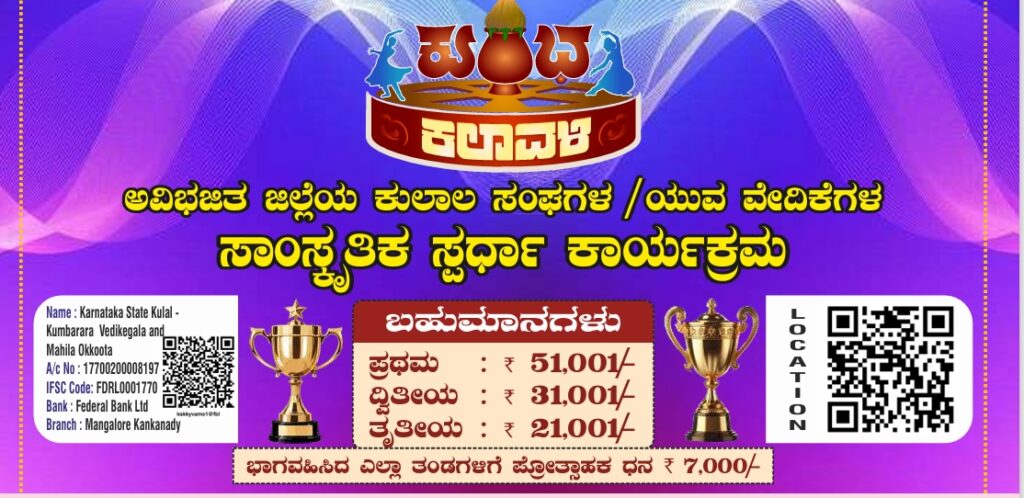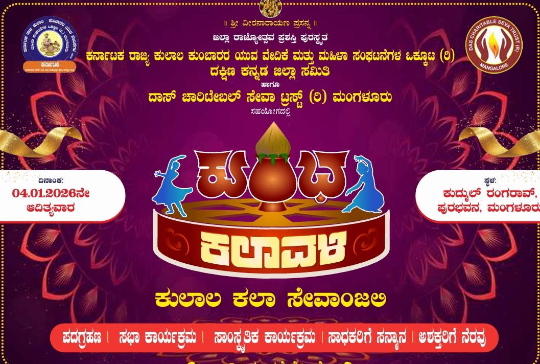 ಮಂಗಳೂರು : ಜಿಲ್ಲಾ ರಾಜ್ಯೋತ್ಸವ ಪ್ರಶಸ್ತಿ ಪುರಸ್ಕೃತ ಕರ್ನಾಟಕ ರಾಜ್ಯ ಕುಲಾಲ ಕುಂಬಾರರ ಯುವ ವೇದಿಕೆ ಮತ್ತು ಮಹಿಳಾ ಸಂಘಟನೆಗಳ ಒಕ್ಕೂಟ (ರಿ) ದಕ್ಷಿಣ ಕನ್ನಡ ಜಿಲ್ಲಾ ಸಮಿತಿ ಹಾಗೂ ದಾಸ್ ಚಾರಿಟೇಬಲ್ ಸೇವಾ ಟ್ರಸ್ಟ್ (ರಿ) ಮಂಗಳೂರು ಇದರ ಸಹಯೋಗದಲ್ಲಿ “ಕುಂಭಕಲಾವಳಿ ಕುಲಾಲ ಕಲಾ ಸೇವಾಂಜಲಿ” ಕಾಯ೯ಕ್ರಮ ಮಂಗಳೂರಿನ ಕುದ್ಮುಲ್ ರಂಗರಾವ್, ಪುರಭವನದಲ್ಲಿ ಜ. 04ರಂದು ನಡೆಯಲಿದೆ.
