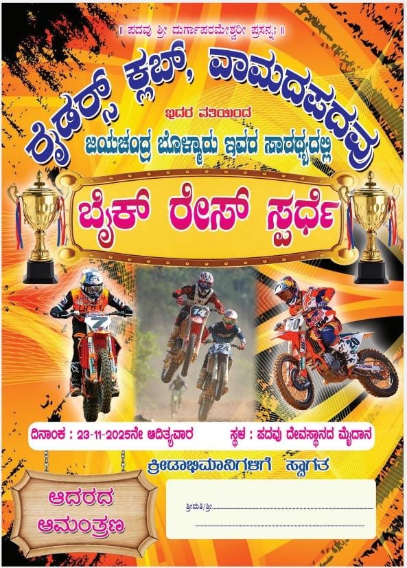 ಬಂಟ್ವಾಳ: ರೈಡರ್ಸ್ ಕ್ಲಬ್ ವಾಮದಪದವು ಇದರ ವತಿಯಿಂದ ಪದವು ಶ್ರೀ ದುರ್ಗಾ ಪರಮೇಶ್ವರಿ ದೇವಸ್ಥಾನದ ಮೈದಾನದಲ್ಲಿ ಬೈಕ್ ರೇಸ್ ಸ್ಪರ್ಧೆ ನ.23ರಂದು ನಡೆಯಲಿದೆ.