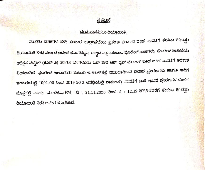 ಪೊಲೀಸ್ ಇಲಾಖೆಯ ಸಂಚಾರಿ ಇ-ಚಲನ್ನಲ್ಲಿ ದಾಖಲಾಗಿರುವ ದಂಡದ ಪ್ರಕರಣಗಳು ಹಾಗೂ ಸಾರಿಗೆ ಇಲಾಖೆಯಲ್ಲಿ 1991-92 ರಿಂದ 2019-20 ರ ಅವಧಿಯಲ್ಲಿ ದಾಖಲಾಗಿ, ಪಾವತಿಗೆ ಬಾಕಿ ಇರುವ ಪ್ರಕರಣಗಳ ದಂಡದ ಮೊತ್ತದಲ್ಲಿ ವಾಹನ ಮಾಲಿಕರುಗಳಿಗೆ ನ. 21 ರಿಂದ ಡಿ. 12 ರವರೆಗೆ ಶೇಕಡಾ 50 ರಷ್ಟು ರಿಯಾಯಿತಿ ನೀಡಿ ಆದೇಶ ಹೊರಡಿಸಿದೆ ಎಂದು ಪ್ರಕಟನೆಯಲ್ಲಿ ತಿಳಿಸಿದ್ದಾರೆ.