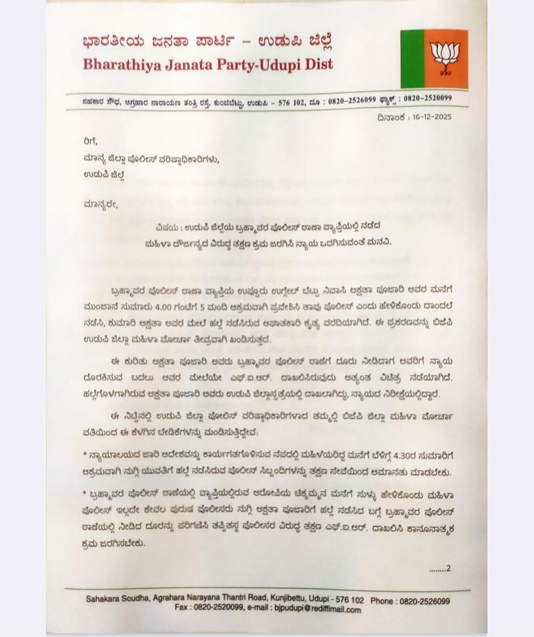 ಉಡುಪಿ: ಜಿಲ್ಲೆಯ ಬ್ರಹ್ಮಾವರ ಪೊಲೀಸ್ ಠಾಣಾ ವ್ಯಾಪ್ತಿಯಲ್ಲಿ ಅಕ್ಷತಾ ಪೂಜಾರಿ ಅವರ ಮೇಲೆ ನಡೆದ ಮಹಿಳಾ ದೌರ್ಜನ್ಯದ ವಿರುದ್ಧ ತಕ್ಷಣ ಕ್ರಮ ಜರುಗಿಸಿ ನ್ಯಾಯ ಒದಗಿಸುವಂತೆ ಡಿ.16 ರಂದು ಭಾರತೀಯ ಜನತಾ ಪಾರ್ಟಿ ಮಹಿಳಾಮೋರ್ಚಾದ ವತಿಯಿಂದ ಜಿಲ್ಲಾ ಪೊಲೀಸ್ ವರಿಷ್ಠಾಧಿಕಾರಿ ಹರಿರಾಮ್ ಶಂಕರ್ ಅವರನ್ನು ಭೇಟಿ ಮಾಡಿ ಮನವಿಯನ್ನು ಸಲ್ಲಿಸಲಾಯಿತು.
