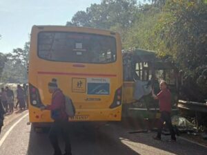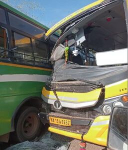 ಸಾಗರದಿಂದ ಕಾರ್ಗಲ್ ಮಾರ್ಗವಾಗಿ ಸಿಗಂದೂರಿಗೆ ಹೋಗುತ್ತಿದ್ದ ಕೆಎಸ್ಆರ್ಟಿಸಿ ಬಸ್ ಮತ್ತು ಖಾಸಗಿ ಶಾಲಾ ಬಸ್ ಮಧ್ಯೆ ಅಪಘಾತ ಸಂಭವಿಸಿದ್ದು, ಎರಡು ಬಸ್ಸಿನ ಮುಂಭಾಗ ಸಂಪೂರ್ಣ ನಜ್ಜುಗುಜ್ಜಾಗಿದೆ.