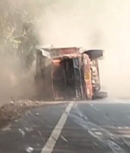 ಹಿರಿಯಡ್ಕ: ಕುಡಿದ ಮತ್ತಿನಲ್ಲಿ ಲಾರಿ ಚಾಲಕನೊಬ್ಬ ಲಾರಿ ಚಲಾಯಿಸಿದ ಪರಿಣಾಮ ನಿಯಂತ್ರಣ ತಪ್ಪಿದ ಲಾರಿ ರಸ್ತೆ ಮಧ್ಯೆದಲ್ಲೇ ಪಲ್ಟಿಯಾದ ಘಟನೆ ಹಿರಿಯಡ್ಕ ಗುಡ್ಡೆಅಂಗಡಿ ಸಮೀಪ ನಡೆದಿದೆ.