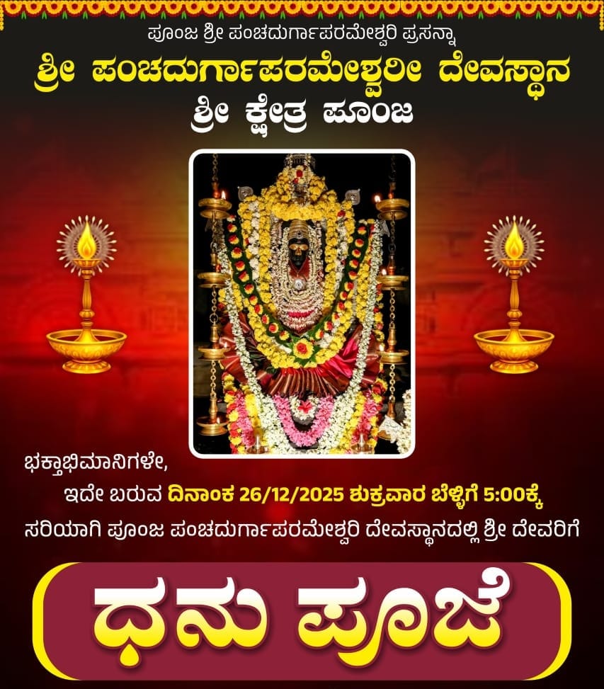 ಬಂಟ್ವಾಳ: ಶ್ರೀ ಕ್ಷೇತ್ರ ಪೂಂಜದ ಶ್ರೀ ಪಂಚದುರ್ಗಾಪರಮೇಶ್ವರೀ ದೇವಸ್ಥಾನದಲ್ಲಿ ಡಿ. 26 ರಂದು ಧನು ಪೂಜೆ ನಡೆಯಲಿದೆ.