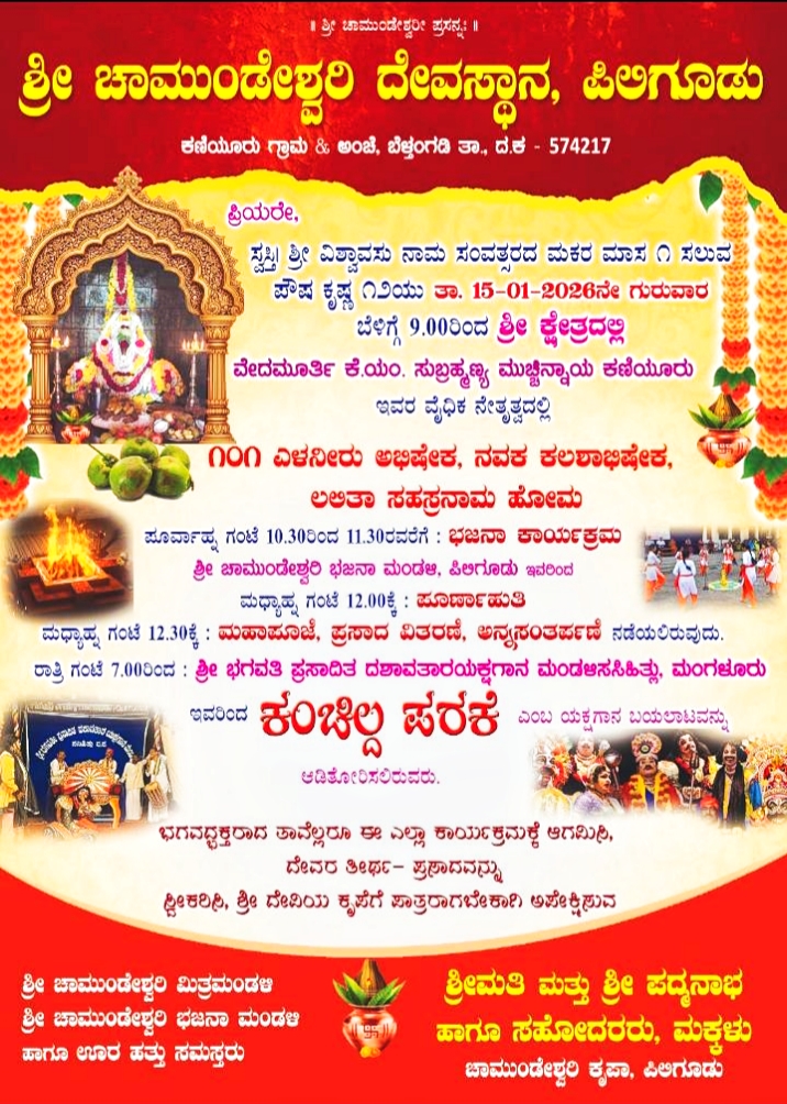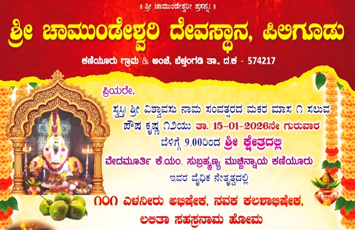 ಬೆಳ್ತಂಗಡಿ: ಪಿಲಿಗೂಡು ಶ್ರೀ ಚಾಮುಂಡೇಶ್ವರಿ ದೇವಸ್ಥಾನದಲ್ಲಿ ಜ. 15ರಂದು 101ಎಳನೀರು ಅಭಿಷೇಕ, ನವಕ ಕಲಶಾಭಿಷೇಕ, ಲಲಿತಾ ಸಹಸ್ರನಾಮ ಹೋಮ ನಡೆಯಲಿದೆ.