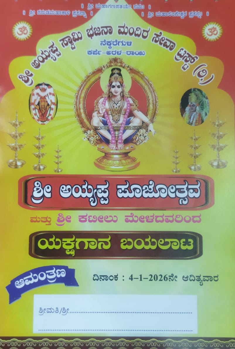 ಬಂಟ್ವಾಳ: ಶ್ರೀ ಅಯ್ಯಪ್ಪ ಸ್ವಾಮಿ ಭಜನಾ ಮಂದಿರ ಸೇವಾ ಟ್ರಸ್ಟ್(ರಿ.) ನೆಕ್ಕರೆಗುಳಿ ಕರ್ಪೆ ಇವರ ಆಶ್ರಯದಲ್ಲಿ ಶ್ರೀ ಅಯ್ಯಪ್ಪ ಪೂಜೋತ್ಸವ ಹಾಗೂ ಶ್ರೀ ಕಟೀಲು ಮೇಳದವರಿಂದ ಯಕ್ಷಗಾನ ಬಯಲಾಟವು ಜ. 4 ರಂದು ನಡೆಯಲಿದೆ.