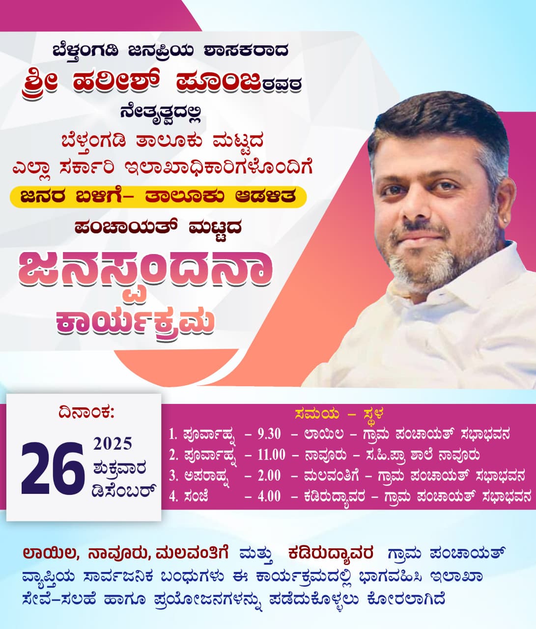 ಈ ಕಾರ್ಯಕ್ರಮವು ವಿವಿಧ ಗ್ರಾಮ ಪಂಚಾಯತ್ ವ್ಯಾಪ್ತಿಯಲ್ಲಿ ನಡೆಯಲಿದ್ದು ಬೆಳಿಗ್ಗೆ 9.30 ಗಂಟೆಗೆ ಗ್ರಾಮ ಪಂಚಾಯತ್ ಸಭಾಭವನ ಲಾಯಿಲ, 11.00 ಗಂಟೆಗೆ ನಾವೂರು , ಮಧ್ಯಾಹ್ನ 2.00 ಗಂಟೆಗೆ ಮಲವಂತಿಗೆ, ಸಂಜೆ 4.00 ಗಂಟೆಗೆ ಕಡಿರುದ್ಯಾವರ ಜನಸ್ಪಂದನಾ ಕಾರ್ಯಕ್ರಮವು ನಡೆಯಲಿದೆ.