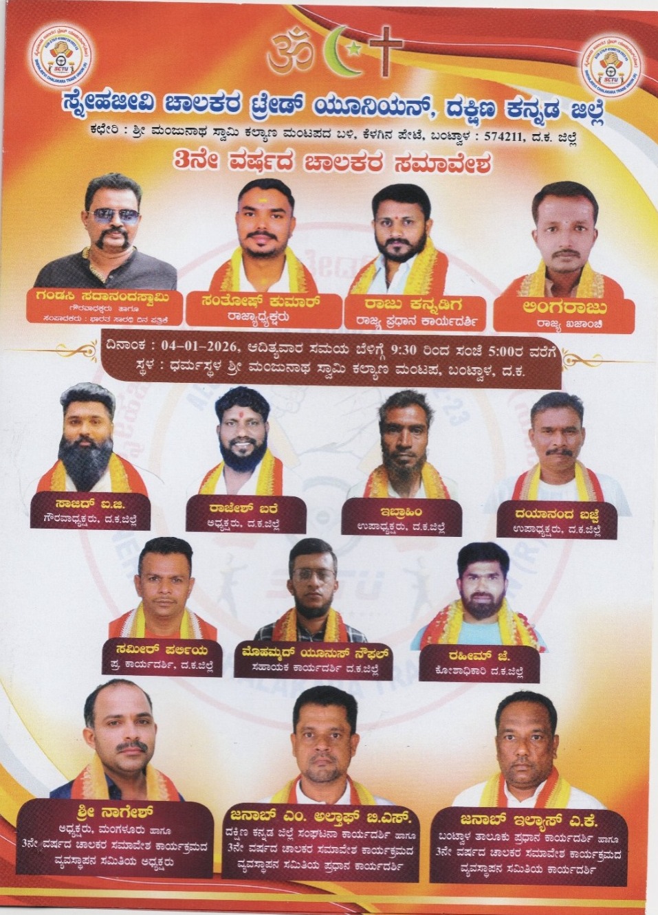 ಈ ಸಮಾವೇಶವನ್ನು ದಕ್ಷಿಣ ಕನ್ನಡ ಜಿಲ್ಲೆಯ ಸ್ನೇಹಜೀವಿ ಚಾಲಕರ ಟ್ರೇಡ್ ಯೂನಿಯನ್ ಜಿಲ್ಲಾಧ್ಯಕ್ಷರು ರಾಜೇಶ್ ಬರೆ ಉದ್ಘಾಟಿಸಲಿದ್ದು, ಸಮಾವೇಶದ ಅಧ್ಯಕ್ಷತೆಯನ್ನು ದಕ್ಷಿಣ ಕನ್ನಡ ಜಿಲ್ಲೆಯ ಸ್ನೇಹಜೀವಿ ಚಾಲಕರ ಟ್ರೇಡ್ ಯೂನಿಯನ್ ಗೌರಾವಾಧ್ಯಕ್ಷರು ಸಾಜಿದ್ ಐ. ಜಿ ಸುಳ್ಯ ವಹಿಸಲಿದ್ದಾರೆ.