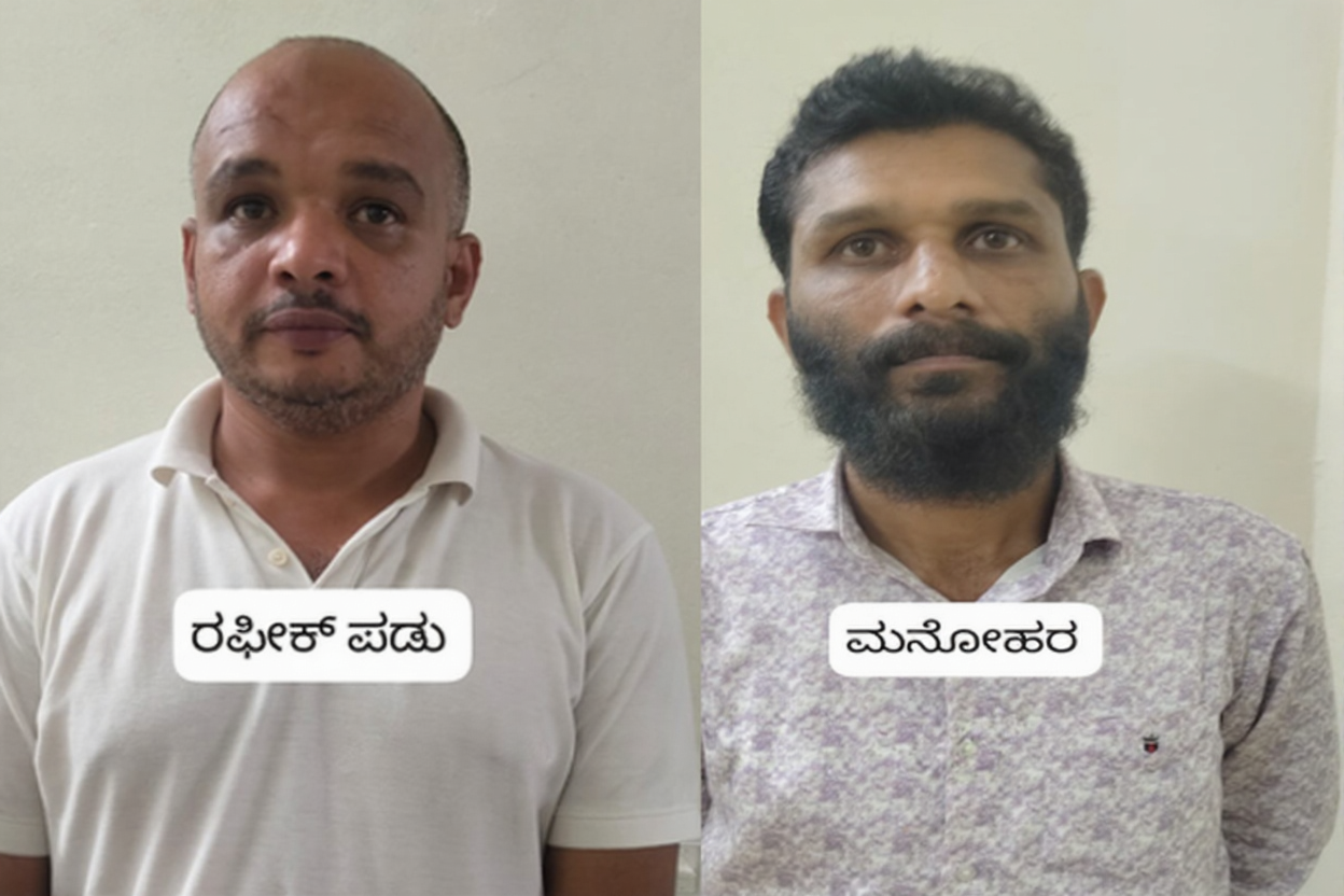 ಬಂಧಿತ ಆರೋಪಿಗಳನ್ನು ಸುಳ್ಯ ಕಸಬ ನಿವಾಸಿ ಮೊಹಮ್ಮದ್ ರಫೀಕ್ (41), ಸುಳ್ಯ ಸಂಪಾಜೆ ನಿವಾಸಿ ಮನೋಹರ್ ಕೆ ಎಸ್ ಯಾನೆ ಮನು (42) ಎಂದು ಗುರುತಿಸಲಾಗಿದೆ.