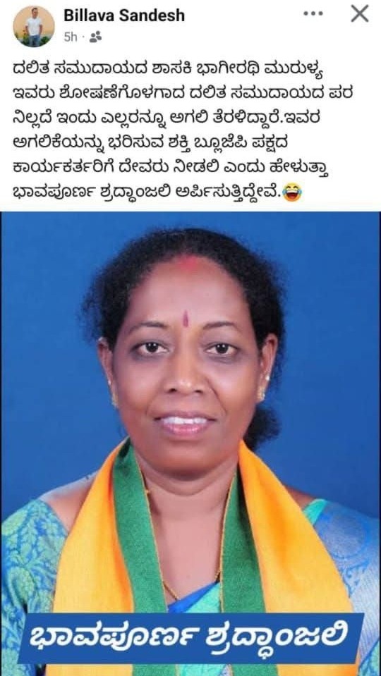ಸುಳ್ಯ: ಫೇಸ್ಬುಕ್ ನಲ್ಲಿ ಸುಳ್ಯ ಶಾಸಕಿ ಭಾಗೀರಥಿ ಮುರುಳ್ಯರ ಭಾವಚಿತ್ರಕ್ಕೆ ಶ್ರದ್ಧಾಂಜಲಿ ಹಾಕಿರುವ ಬಿಲ್ಲವ ಸಂದೇಶ್ ಎಂಬಾತನ ವಿರುದ್ಧ ಸಾಮಾಜಿಕ ಜಾಲತಾಣಗಳಲ್ಲಿ ಭಾರೀ ಆಕ್ರೋಶ ವ್ಯಕ್ತವಾಗಿದೆ.