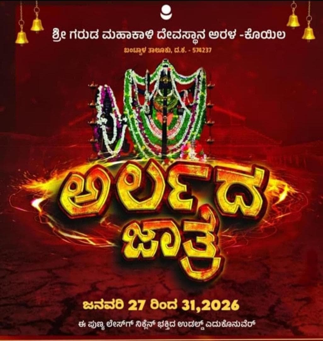 ಬಂಟ್ವಾಳ: ಅರಳ ಮತ್ತು ಕೊಯಿಲ ಗ್ರಾಮಗಳ ಗ್ರಾಮದೇವತೆ ಅರಳ ಶ್ರೀ ಗರುಡ ಮಹಾಕಾಳಿ ದೇವಸ್ಥಾನದಲ್ಲಿ ಜ.27ರಿಂದ ಫೆ. 1ರ ತನಕ ವಾರ್ಷಿಕ ಜಾತ್ರಾ ಮಹೋತ್ಸವ ನಡೆಯಲಿದೆ.