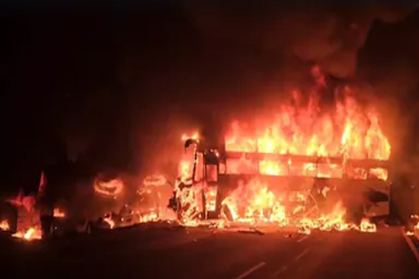 ಆಂಧ್ರಪ್ರದೇಶ: ನಂದ್ಯಾಲ್ ಜಿಲ್ಲೆಯಲ್ಲಿ ಟಯರ್ ಸ್ಫೋಟಗೊಂಡು ನಿಯಂತ್ರಣ ಕಳೆದುಕೊಂಡ ಬಸ್ ಕಂಟೈನರ್ ಲಾರಿಗೆ ಡಿಕ್ಕಿ ಹೊಡೆದು ಮೂವರು ಸಜೀವ ದಹನವಾದ ಘಟನೆ ಇಂದು(ಜ. 22) ನಡೆದಿದೆ.