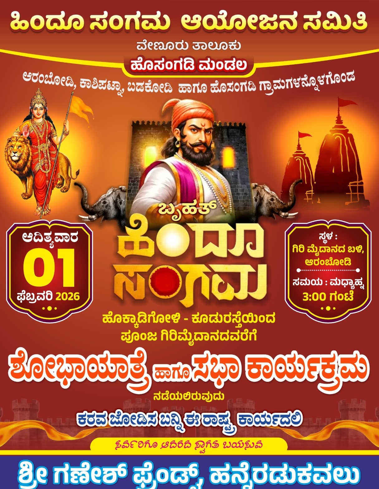 ಬಂಟ್ವಾಳ: ಹಿಂದೂ ಸಂಗಮ ಆಯೋಜನ ಸಮಿತಿ ವೇಣೂರು ತಾಲೂಕು ಹೊಸಂಗಡಿ ಮಂಡಲ ಆಶ್ರಯದಲ್ಲಿ ಆರಂಬೋಡಿ, ಕಾಶಿಪಟ್ನಾ, ಬಡಕೋಡಿ ಹಾಗೂ ಹೊಸಂಗಡಿ ಗ್ರಾಮಗಳನ್ನು ಒಳಗೊಂಡ ಬೃಹತ್ ಹಿಂದೂ ಸಂಗಮ ಕಾರ್ಯಕ್ರಮವು ಫೆ. 1 ರಂದು ಆರಂಬೋಡಿ ಗಿರಿ ಮೈದಾನದ ಬಳಿ ನಡೆಯಲಿದೆ.