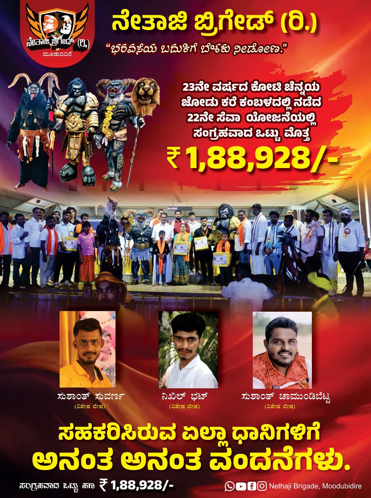 ನೇತಾಜಿ ಬ್ರಿಗೇಡ್ (ರಿ.), ಮೂಡುಬಿದಿರೆ ವತಿಯಿಂದ ಹಮ್ಮಿಕೊಂಡ 22ನೇ ಸೇವಾ ಯೋಜನೆ ಮೂಡುಬಿದಿರೆ ಕೋಟಿ–ಚೆನ್ನಯ ಜೋಡುಕರೆ ಕಂಬಳ ಮೈದಾನದಲ್ಲಿ ಯಶಸ್ವಿಯಾಗಿ ನಡೆಯಿತು.