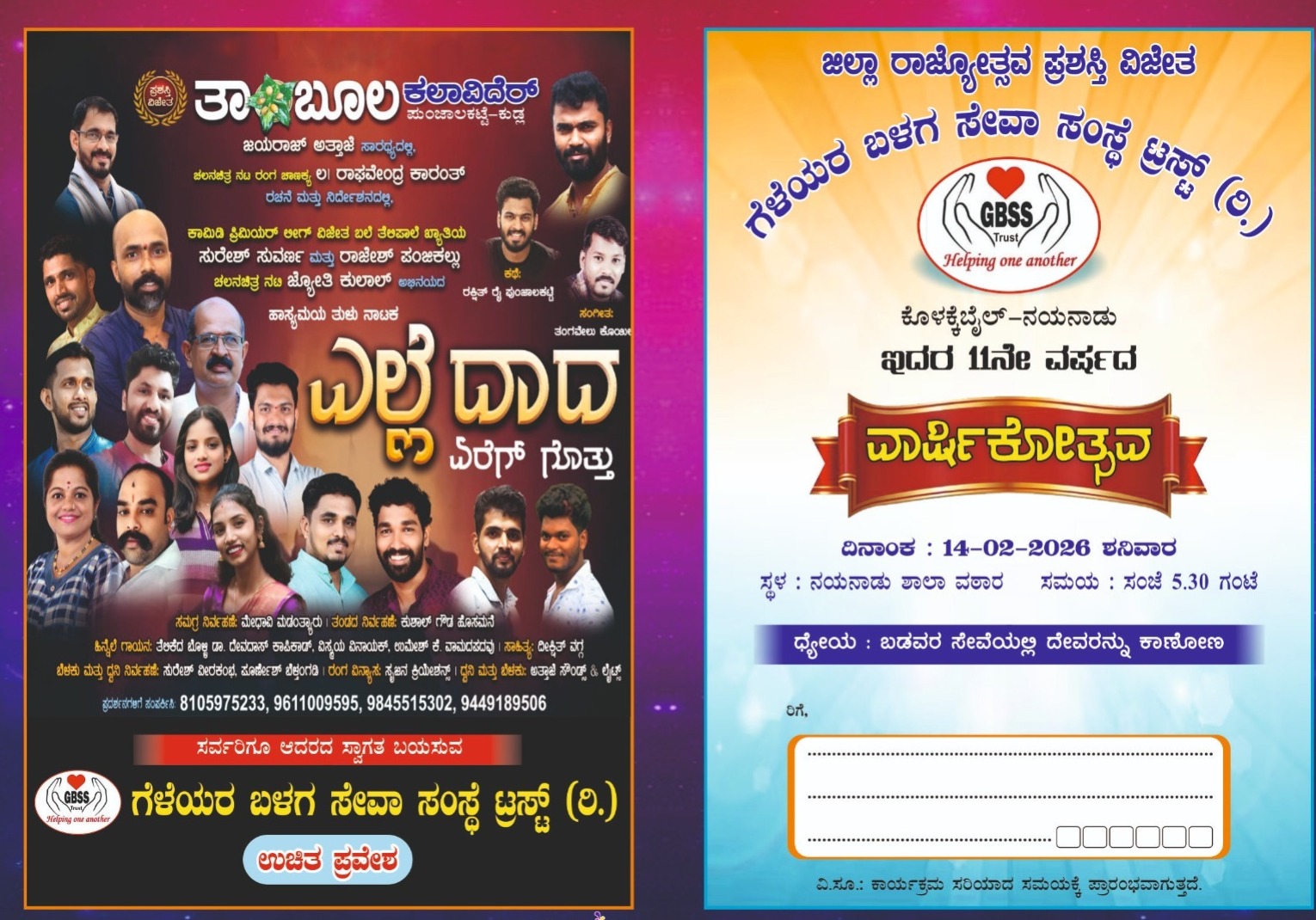 ಪುಂಜಾಲಕಟ್ಟೆ: ದ.ಕ.ಜಿಲ್ಲಾ ರಾಜ್ಯೋತ್ಸವ ಪ್ರಶಸ್ತಿ ಪುರಸ್ಕೃತ ಸಮಾಜ ಸೇವಾ ಸಂಘಟನೆಯಾದ ಬಂಟ್ವಾಳ ತಾಲೂಕಿನ ಪಿಲಾತಬೆಟ್ಟು ಗ್ರಾಮದ ಕೊಳಕ್ಕೆ, ನಯನಾಡು ಗೆಳೆಯರ ಬಳಗ ಸೇವಾ ಸಂಸ್ಥೆ ಟ್ರಸ್ಟ್ ಇದರ 11 ನೇ ವಾರ್ಷಿಕೋತ್ಸವ ಮತ್ತು ಸಾಧಕ ಪ್ರಶಸ್ತಿ ವಿತರಣಾ ಕಾರ್ಯಕ್ರಮವು ಫೆ.14 ರಂದು ನಯನಾಡು ಹಿ.ಪ್ರಾ.ಶಾಲಾ ವಠಾರದಲ್ಲಿ ನಡೆಯಲಿದೆ.