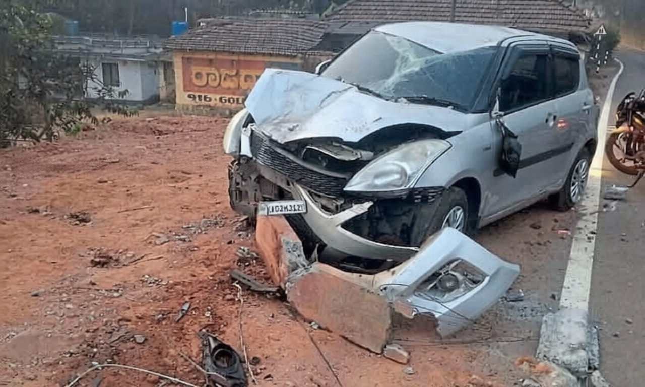 ಕಾರು ಡಿಕ್ಕಿ ಹೊಡೆದ ಪರಿಣಾಮ ವಿದ್ಯುತ್ ಕಂಬ ತುಂಡಾಗಿದ್ದು ವಿದ್ಯುತ್ ಪ್ರವಹಿಸುವ ತಂತಿಗಳು ರಸ್ತೆಗೆ ಬಿದ್ದರೂ ಸಂಭವನೀಯ ದುರಂತ ತಪ್ಪಿದೆ.