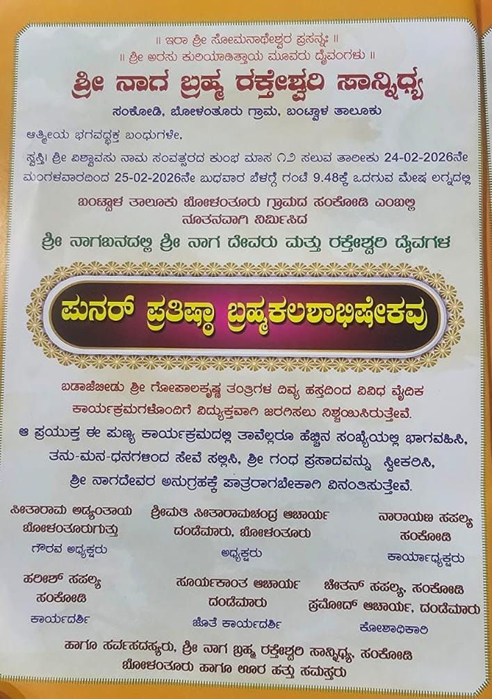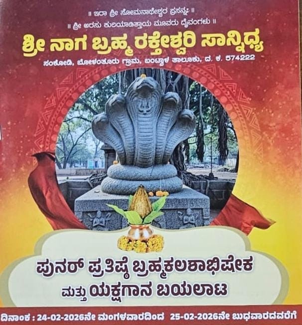 ಕಲ್ಲಡ್ಕ: ಬಂಟ್ವಾಳ ತಾಲೂಕಿನ ಬೋಳಂತೂರು ಗ್ರಾಮದ ಸಂಕೋಡಿ ಎಂಬಲ್ಲಿ ನೂತನವಾಗಿ ನಿರ್ಮಿಸಲಾದ ಶ್ರೀ ನಾಗಬ್ರಹ್ಮ ರಕ್ತೇಶ್ವರಿ ಸಾನ್ನಿಧ್ಯದ ಪುನರ್ಪ್ರತಿಷ್ಠೆ, ಬ್ರಹ್ಮಕಲಶಾಭಿಷೇಕ ಹಾಗೂ ಯಕ್ಷಗಾನ ಬಯಲಾಟ ಕಾರ್ಯಕ್ರಮವು ಫೆ. 25ರಂದು ನಡೆಯಲಿದೆ.