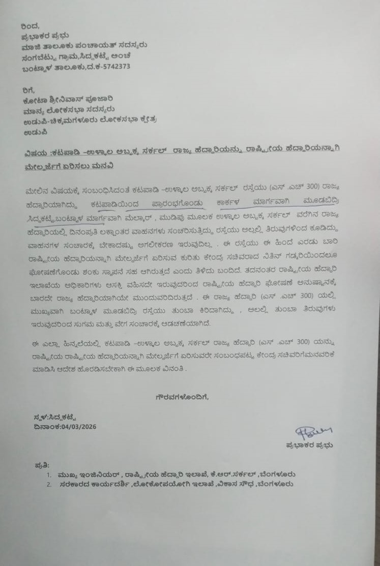 ಈ ಎಲ್ಲಾ ಹಿನ್ನಲೆಯಲ್ಲಿ ಕಟಪಾಡಿ –ಉಳ್ಳಾಲ ಅಬ್ಬಕ್ಕ ಸರ್ಕಲ್ ರಾಜ್ಯ ಹೆದ್ದಾರಿ (ಎಸ್.ಎಚ್ 300) ಯನ್ನು ರಾಷ್ಟ್ರೀಯ ರಾಷ್ಟ್ರೀಯ ಹೆದ್ದಾರಿಯನ್ನಾಗಿ ಮೇಲ್ದರ್ಜೆಗೆ ಏರಿಸುವರೇ ಸಂಬಂಧಪಟ್ಟ ಕೇಂದ್ರ ಸಚಿವರಿಗೆ ಮನವರಿಕೆ ಮಾಡಿಸಿ ಆದೇಶ ಹೊರಡಿಸಬೇಕಾಗಿ ಉಡುಪಿ-ಚಿಕ್ಕಮಗಳೂರು ಲೋಕಸಭಾ ಕ್ಷೇತ್ರದ ಸಂಸದರಾದ ಕೋಟ ಶ್ರೀನಿವಾಸ ಪೂಜಾರಿ ಅವರಿಗೆ ಸಿದ್ಧಕಟ್ಟೆಯ ಸಂಗಬೆಟ್ಟು ಗ್ರಾಮದ ಮಾಜಿ ತಾಲೂಕು ಪಂಚಾಯತ್ ಸದಸ್ಯರಾದ ಪ್ರಭಾಕರ ಪ್ರಭು ವಿನಂತಿಸಿಕೊಂಡಿದ್ದಾರೆ.