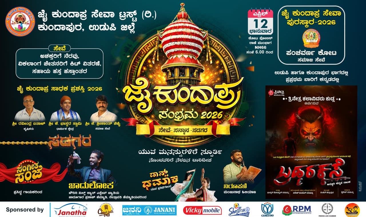 ಇದೇ ಬರುವ ಎ.12 ರಂದು ಕೋಟ ಆರಕ್ಷಕ ಠಾಣೆಯ ಮುಂಭಾಗ ಜೈ ಕುಂದಾಪ್ರ ಸಂಭ್ರಮ- 2026 ಎಂಬ ಶೀರ್ಷಿಕೆಯಡಿ ಸಾಮಾಜಿಕ ಕಾಳಜಿಯ ಕಾರ್ಯಕ್ರಮ ನಡೆಯಲಿದ್ದು ಕೋಟದ ಕ್ರಿಯಾಶೀಲ ಸಂಘಟನೆಯಾದ ಪಂಚವರ್ಣ ಸಂಘಟನೆಗೆ ಜೈ ಕುಂದಾಪ್ರ ಸೇವಾ ಪುರಸ್ಕಾರ ನೀಡಿ ಗೌರವಿಸಲಾಗುತ್ತದೆ.