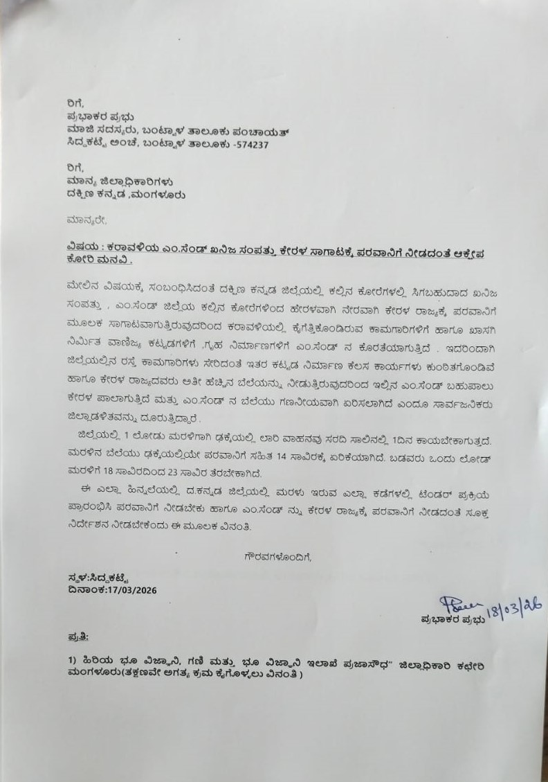 ಬಂಟ್ವಾಳ: ದಕ್ಷಿಣ ಕನ್ನಡ ಜಿಲ್ಲೆಯಲ್ಲಿ ಕಲ್ಲಿನ ಕೋರೆಗಳಲ್ಲಿ ಸಿಗಬಹುದಾದ ಖನಿಜ ಸಂಪತ್ತು , ಎಂ.ಸ್ಯಾಂಡ್ ಜಿಲ್ಲೆಯ ಕಲ್ಲಿನ ಕೋರೆಗಳಿಂದ ಹೇರಳವಾಗಿ ನೇರವಾಗಿ ಕೇರಳ ರಾಜ್ಯಕ್ಕೆ ಪರವಾನಿಗೆ ಮೂಲಕ ಸಾಗಾಟವಾಗುತ್ತಿರುವುದರಿಂದ ಕರಾವಳಿಯಲ್ಲಿ ಕೈಗೆತ್ತಿಕೊಂಡಿರುವ ಕಾಮಗಾರಿಗಳಿಗೆ ಹಾಗೂ ಖಾಸಗಿ ನಿರ್ಮಿತ ವಾಣಿಜ್ಯ ಕಟ್ಟಡಗಳಿಗೆ ,ಗೃಹ ನಿರ್ಮಾಣಗಳಿಗೆ ಎಂ.ಸ್ಯಾಂಡ್ ನ ಕೊರತೆಯಾಗುತ್ತಿದೆ . ಇದರಿಂದಾಗಿ ಜಿಲ್ಲೆಯಲ್ಲಿನ ರಸ್ತೆ ಕಾಮಗಾರಿಗಳು ಸೇರಿದಂತೆ ಇತರ ಕಟ್ಟಡ ನಿರ್ಮಾಣ ಕೆಲಸ ಕಾರ್ಯಗಳು ಕುಂಠಿತಗೊಂಡಿವೆ ಹಾಗೂ ಕೇರಳ ರಾಜ್ಯದವರು ಅತೀ ಹೆಚ್ಚಿನ ಬೆಲೆಯನ್ನು ನೀಡುತ್ತಿರುವುದರಿಂದ ಇಲ್ಲಿನ ಎಂ.ಸ್ಯಾಂಡ್ ಬಹುಪಾಲು ಕೇರಳ ಪಾಲಾಗುತ್ತಿದೆ ಮತ್ತು ಎಂ.ಸ್ಯಾಂಡ್ ನ ಬೆಲೆಯು ಗಣನೀಯವಾಗಿ ಏರಿಸಲಾಗಿದೆ ಎಂದೂ ಸಾರ್ವಜನಿಕರು ಜಿಲ್ಲಾಡಳಿತವನ್ನು ದೂರುತ್ತಿದ್ದಾರೆ .